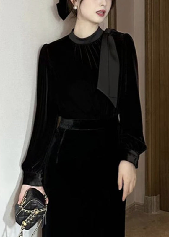 French Pink Bow Wrinkled Silk Velour Shirts Puff Sleeve