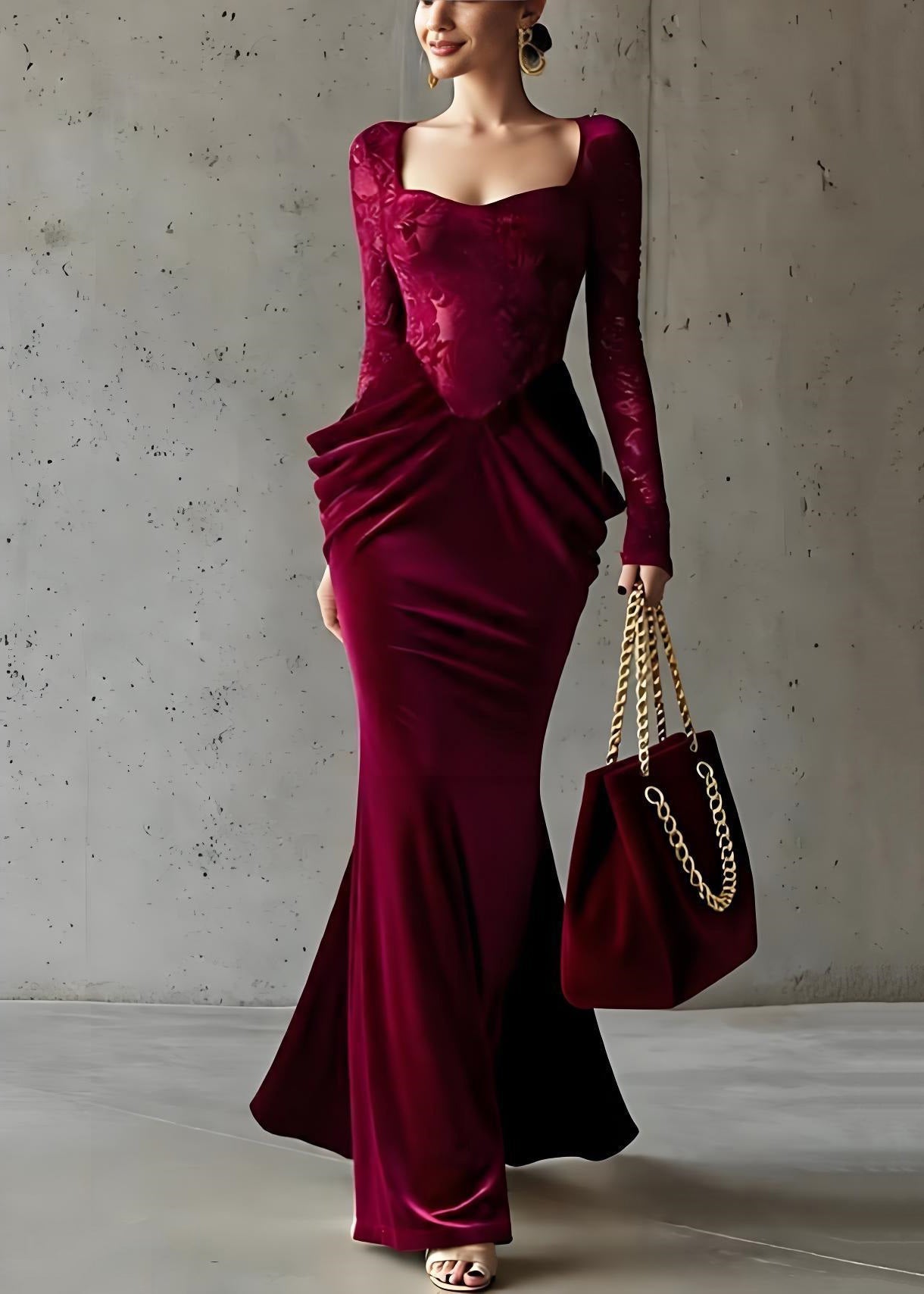 French Red Square Collar Wrinkled Patchwork Silk Velvet Dresses Spring