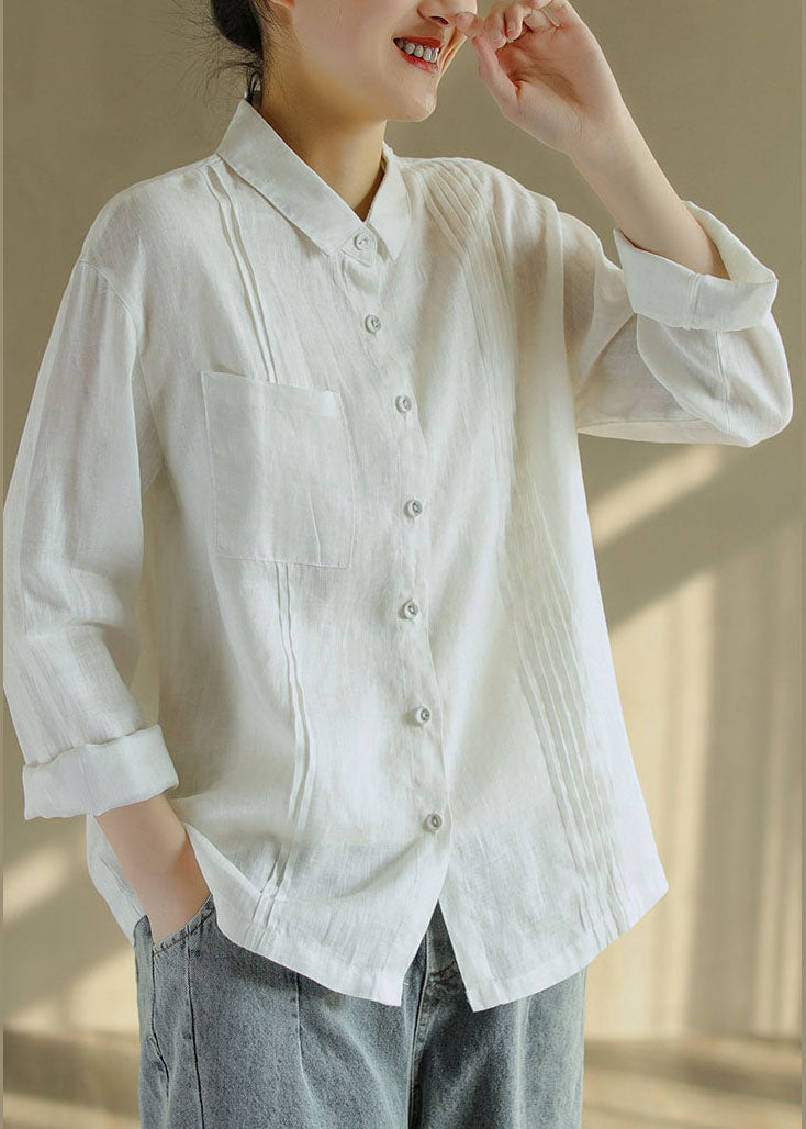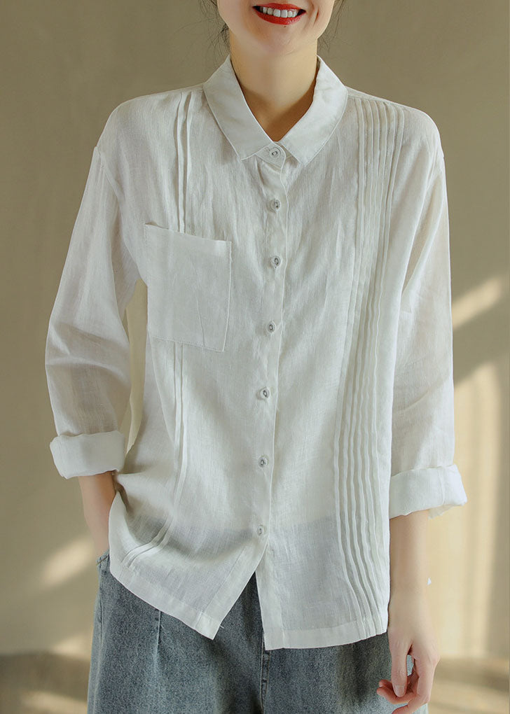 Französische weiße Leinenbluse mit Peter-Pan-Kragen und langen Ärmeln