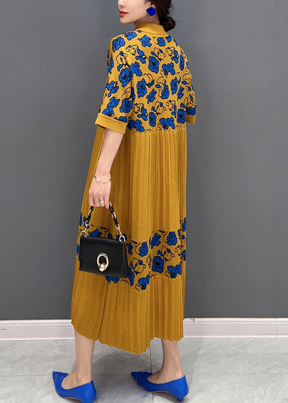 Französisches gelbes Peter-Pan-Kragen-Print-Strick-Patchwork-Maxikleid mit halben Ärmeln