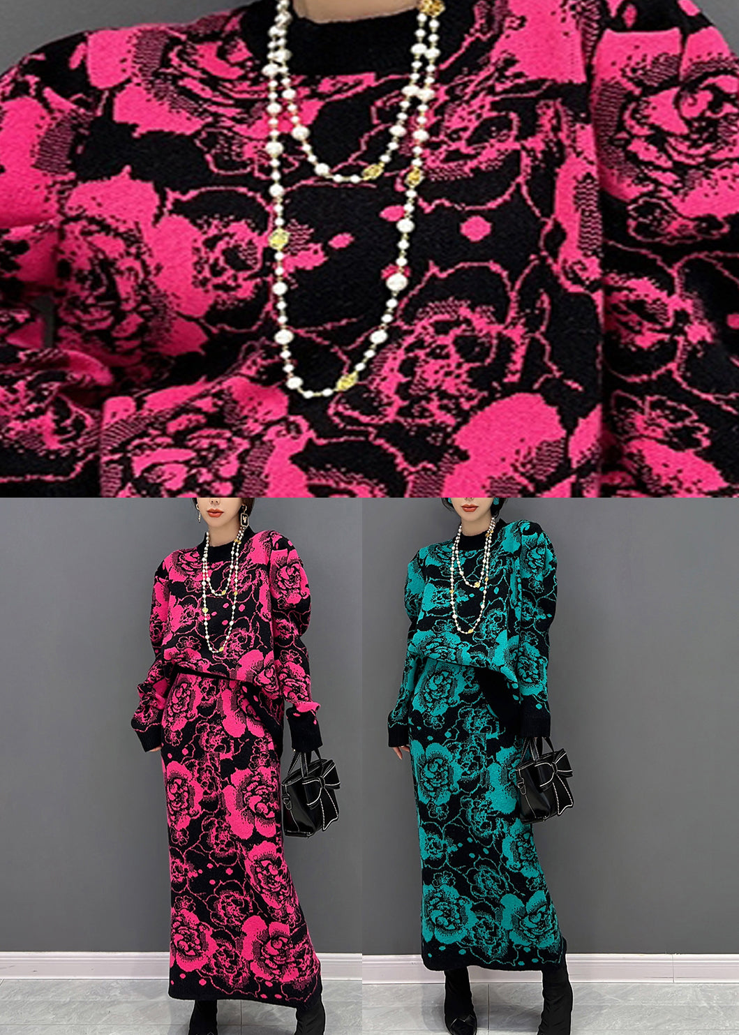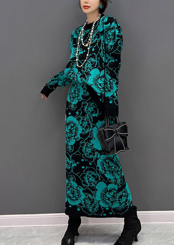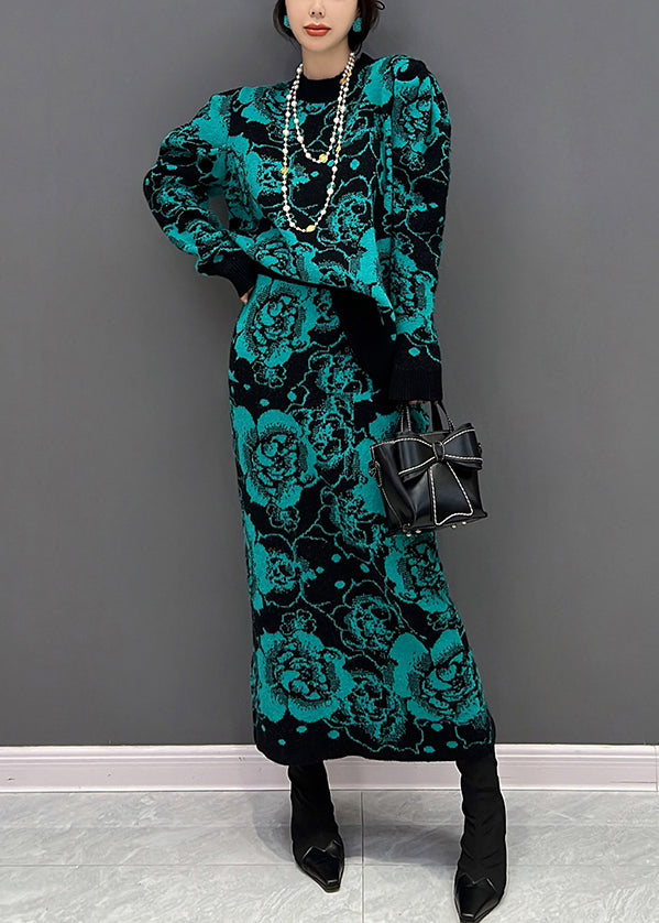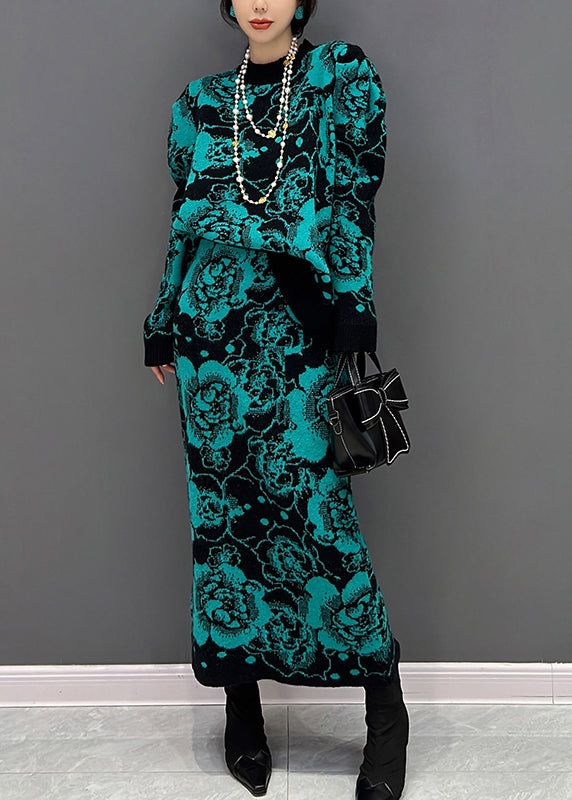 Grünes O-Ausschnitt-Print-Top und Maxi-Röcke, zweiteiliges Set für den Herbst
