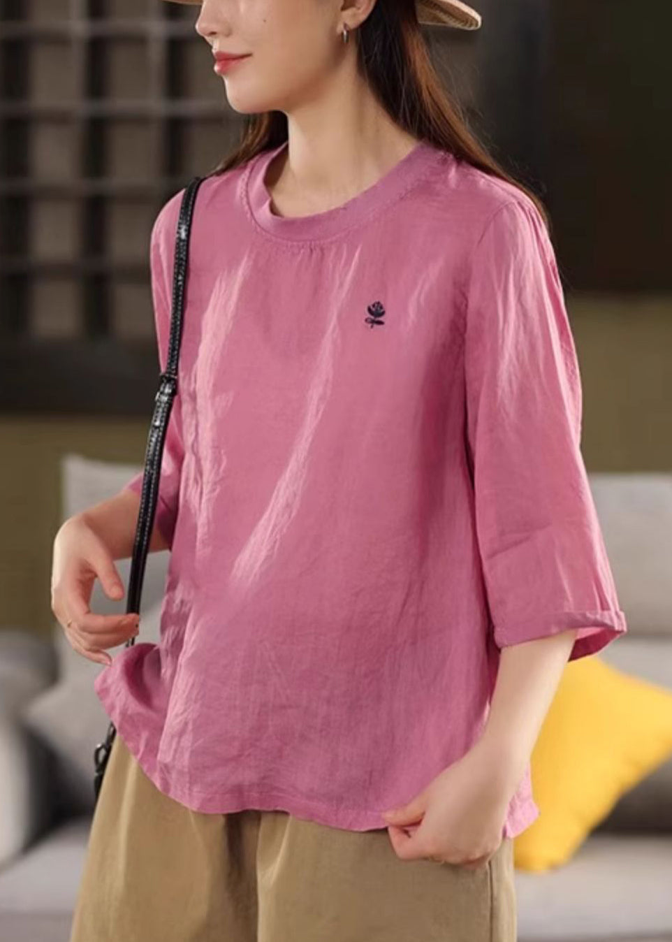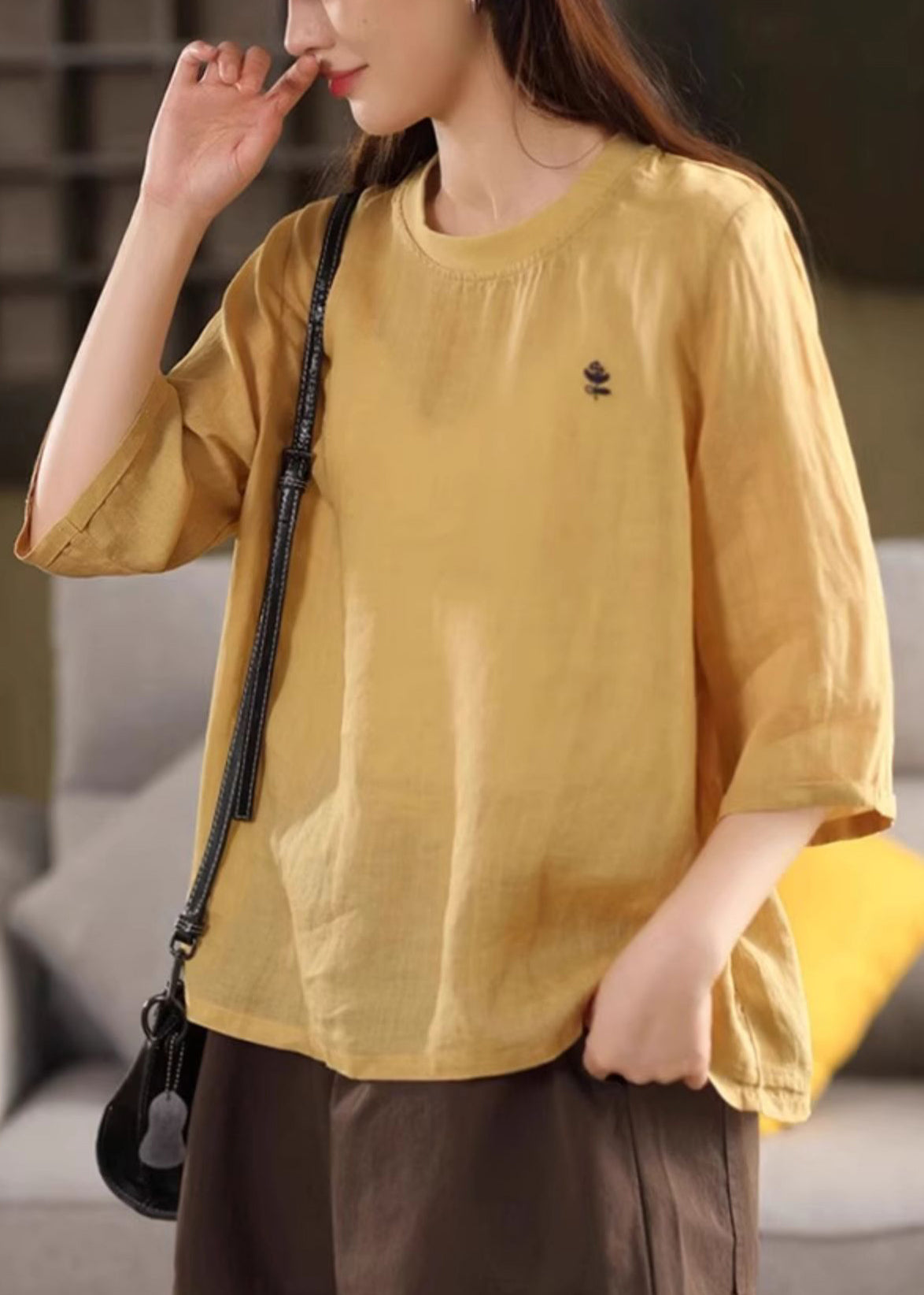 Green Print Cozy Linen Half Sleeve T Shirt O Neck