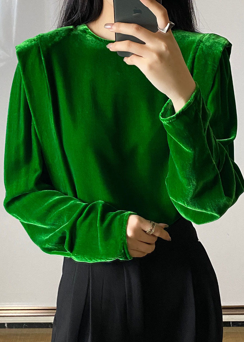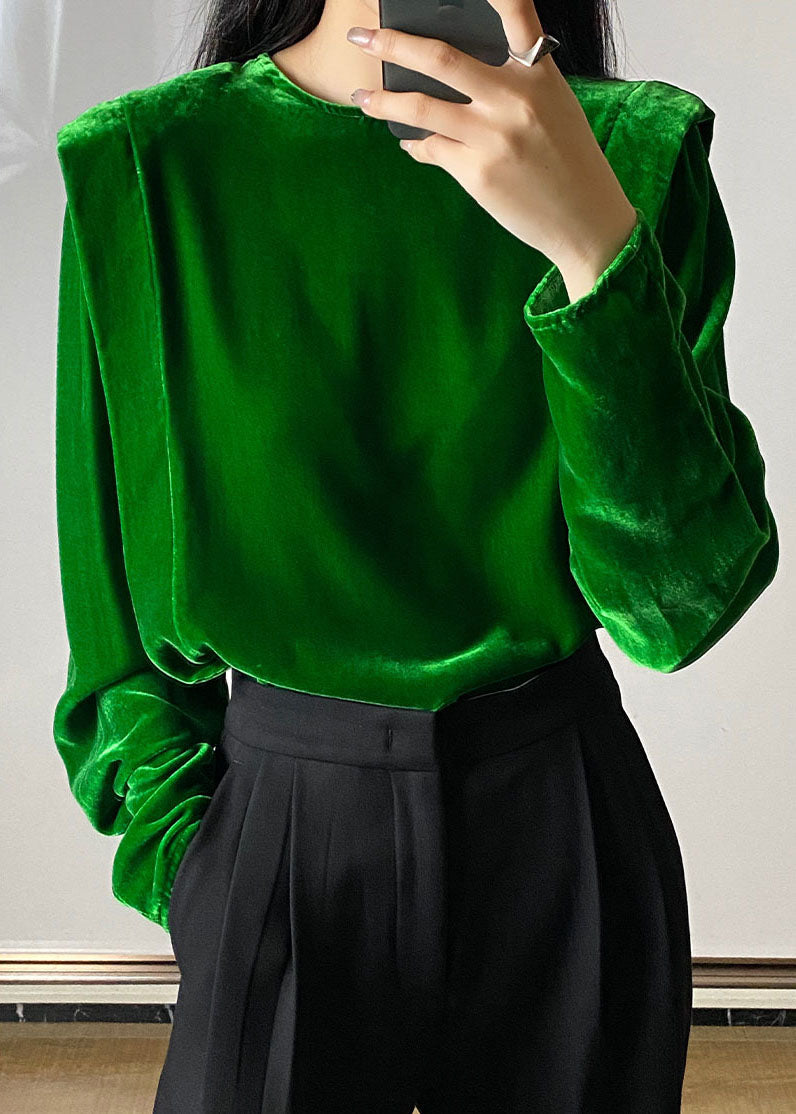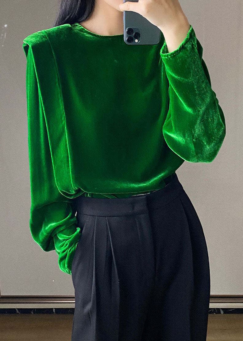Grüne Seidenvelours-Tops mit Knopfleiste, Rundhalsausschnitt, lange Ärmel