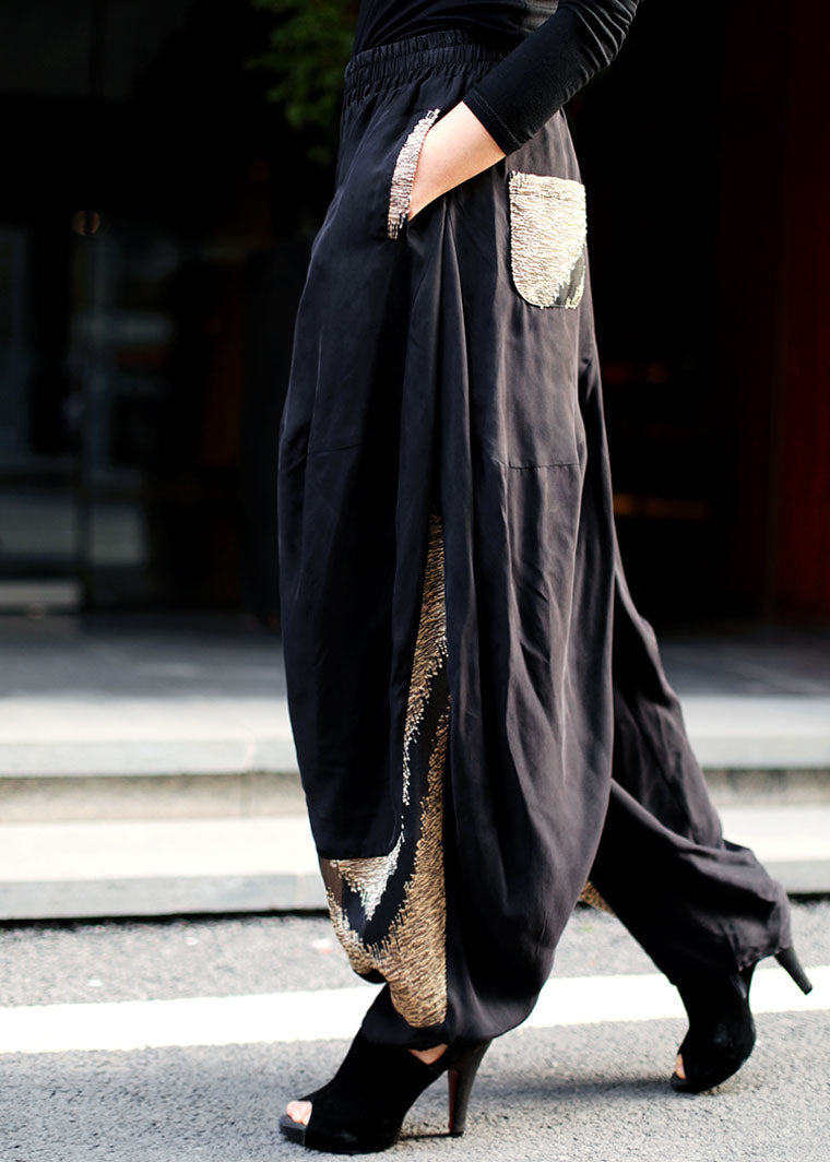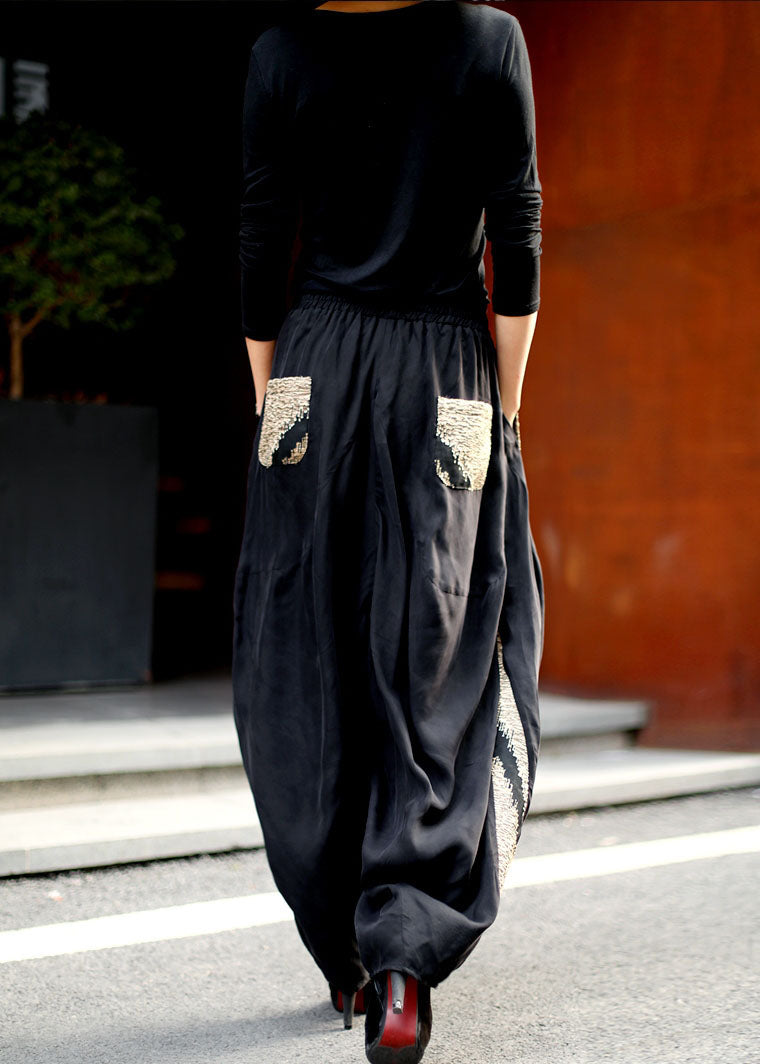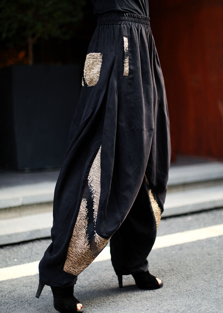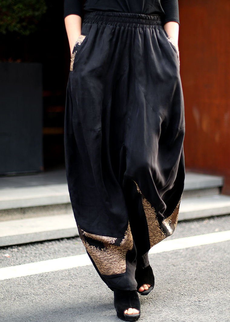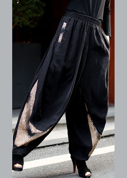 Handgemachte schwarze elastische Taille Patchwork Hose Frühling