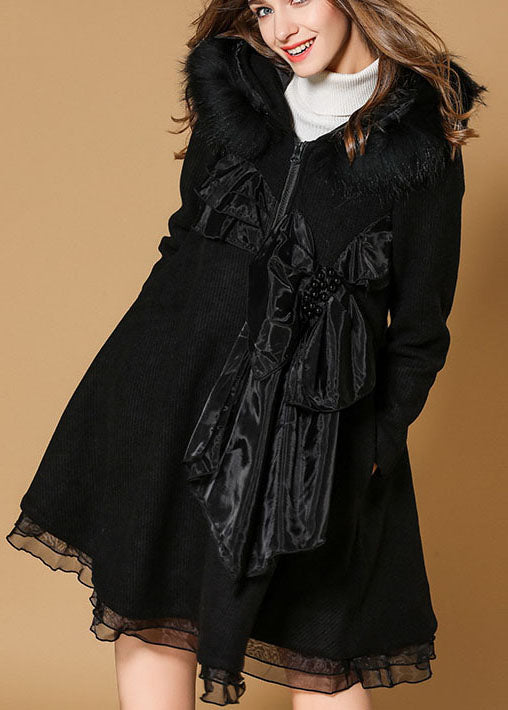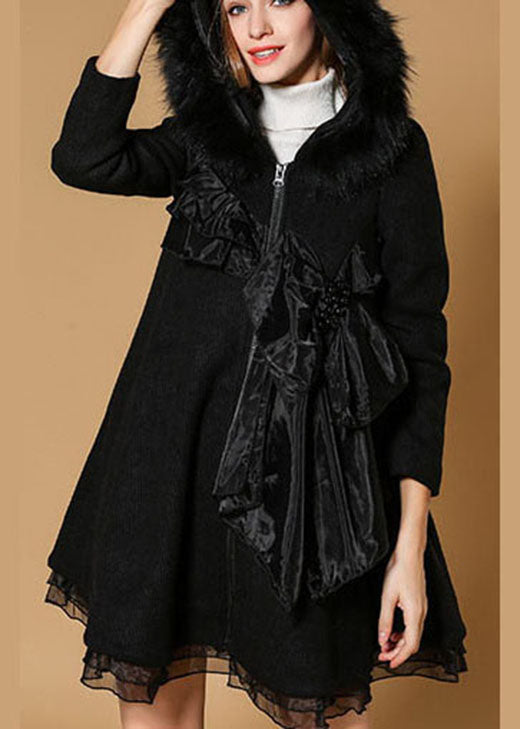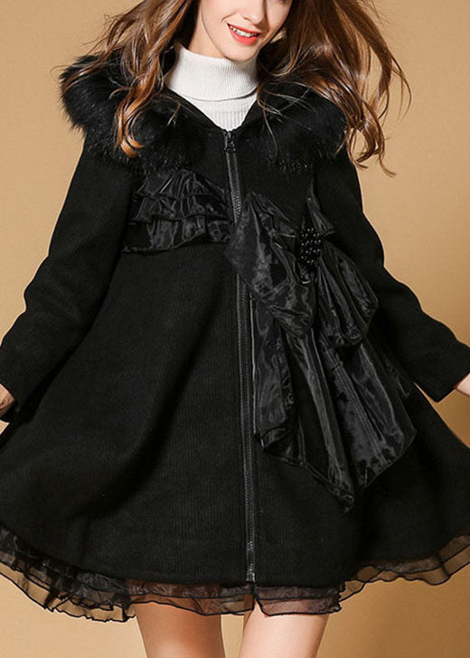 Handgemachter schwarzer Kapuzenpelzkragen Nagelperlen Organza Herbst Wollmantel