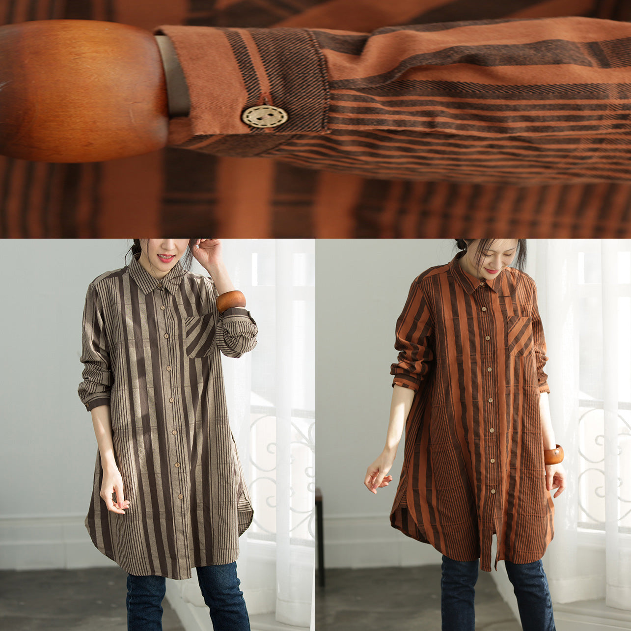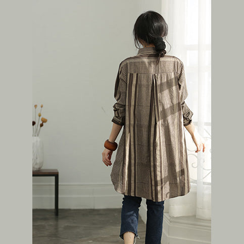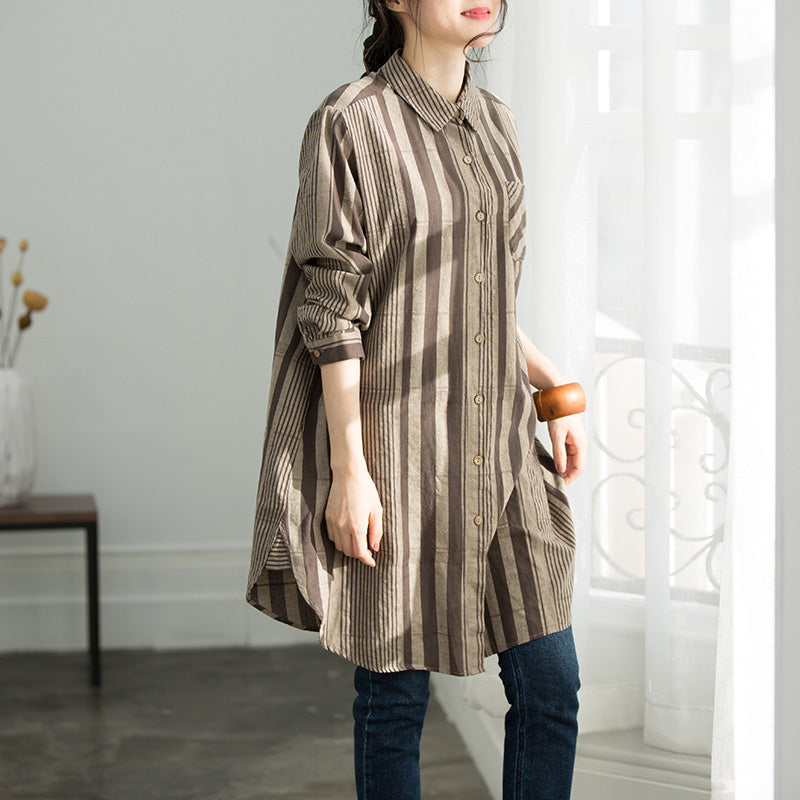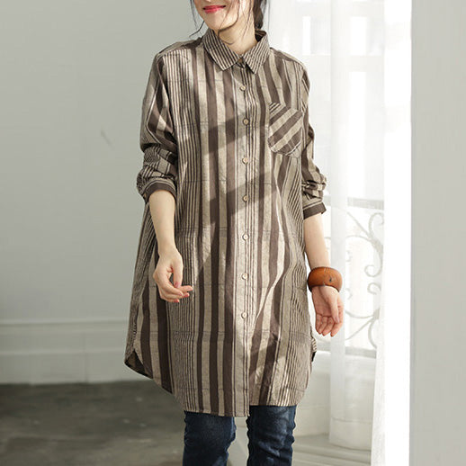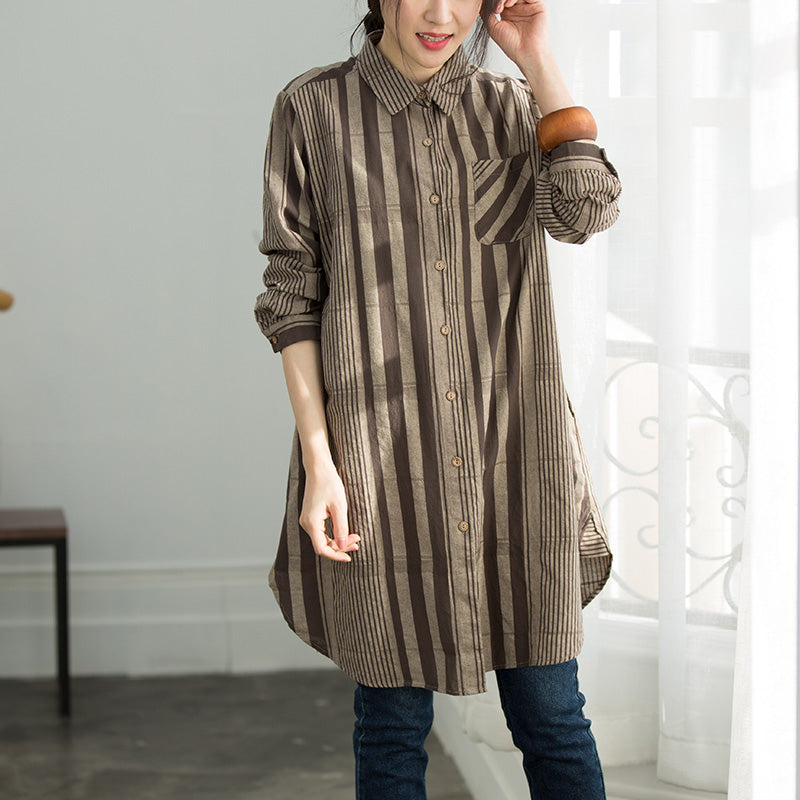 Handgemachte grau schokoladengestreifte Baumwollkleidung für Frauen in Übergrößen Hemden Button Down Kniehemd