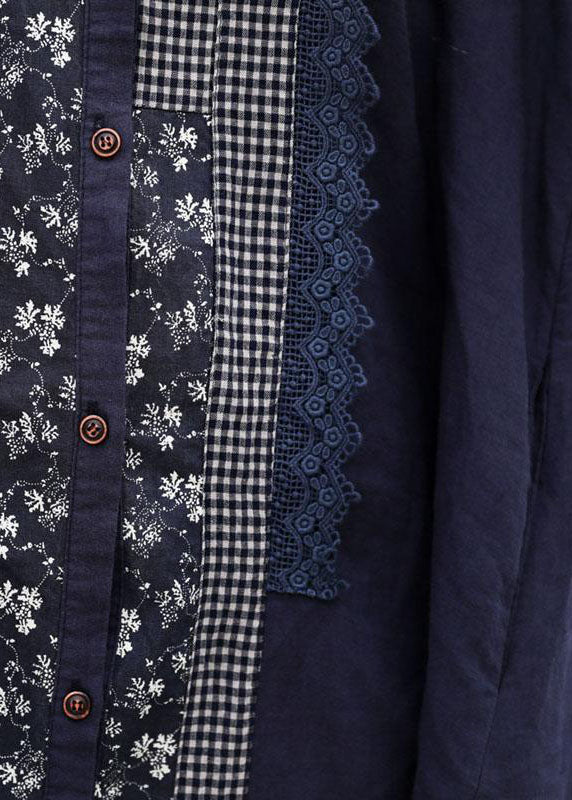 Handgemachte Leinen Roben Mode Retro Blau Splice Turn-down Kragen Leinen Kleid