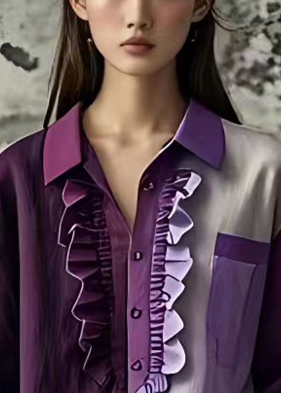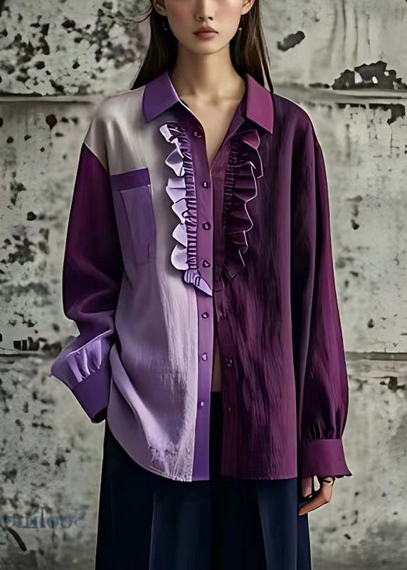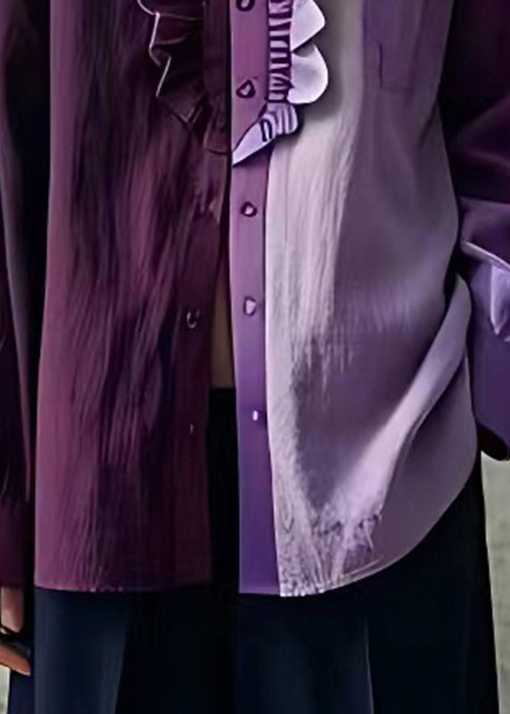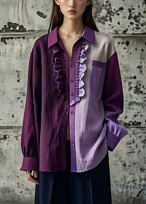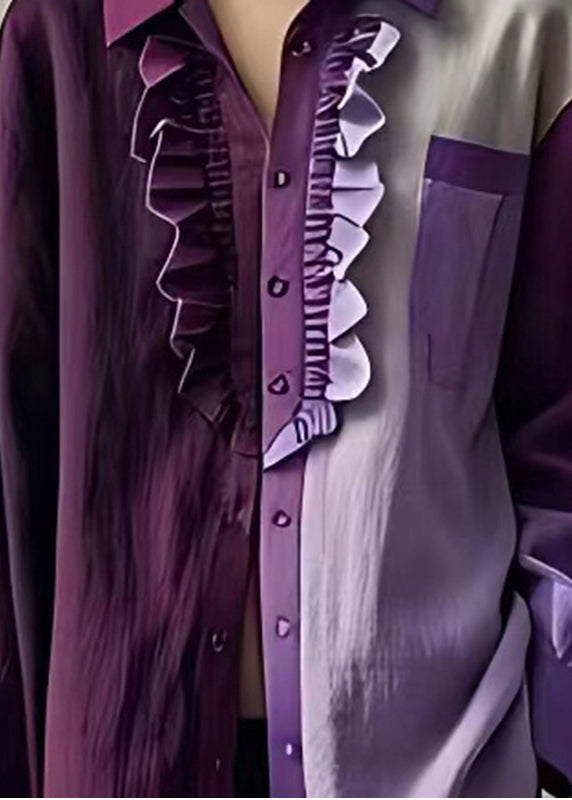Handgemachtes lila asymmetrisches Leinenhemd mit Rüschen für den Herbst