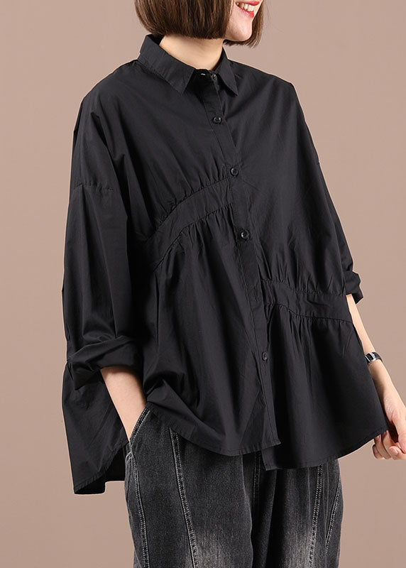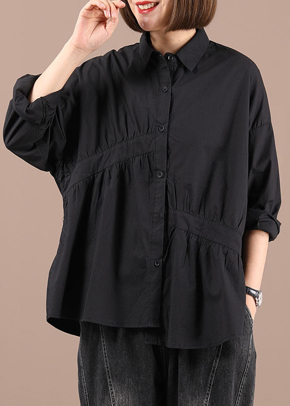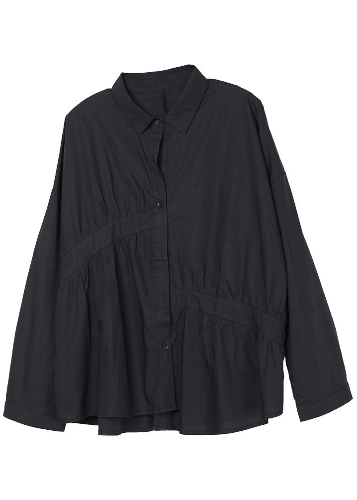 Italienisches schwarzes PeterPan-Kragen-Faltenknopf-Herbsthemd mit langen Ärmeln