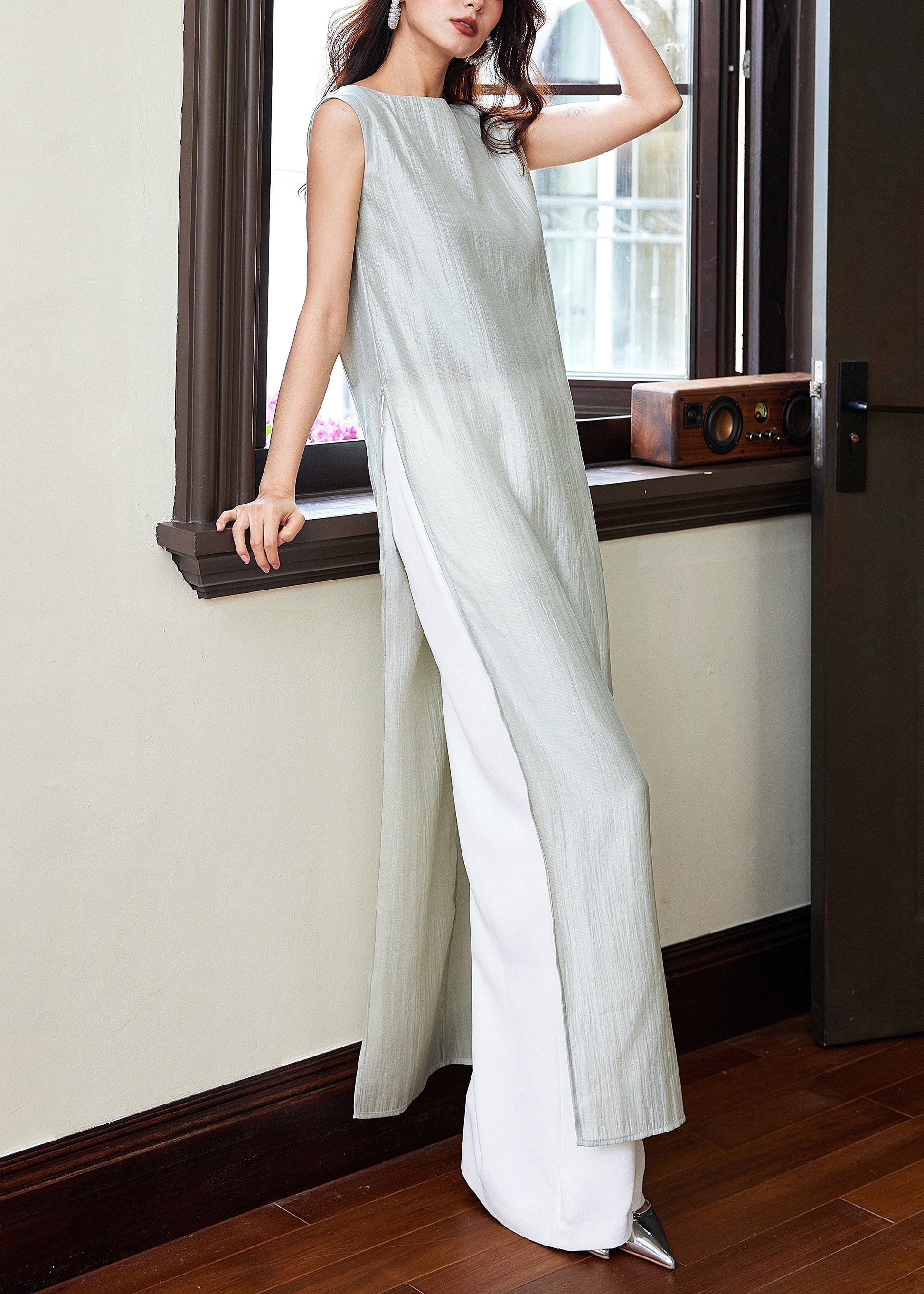 Italian Blue Side Open Tops And White Pants Cotton Two-Piece Set Sleeveless