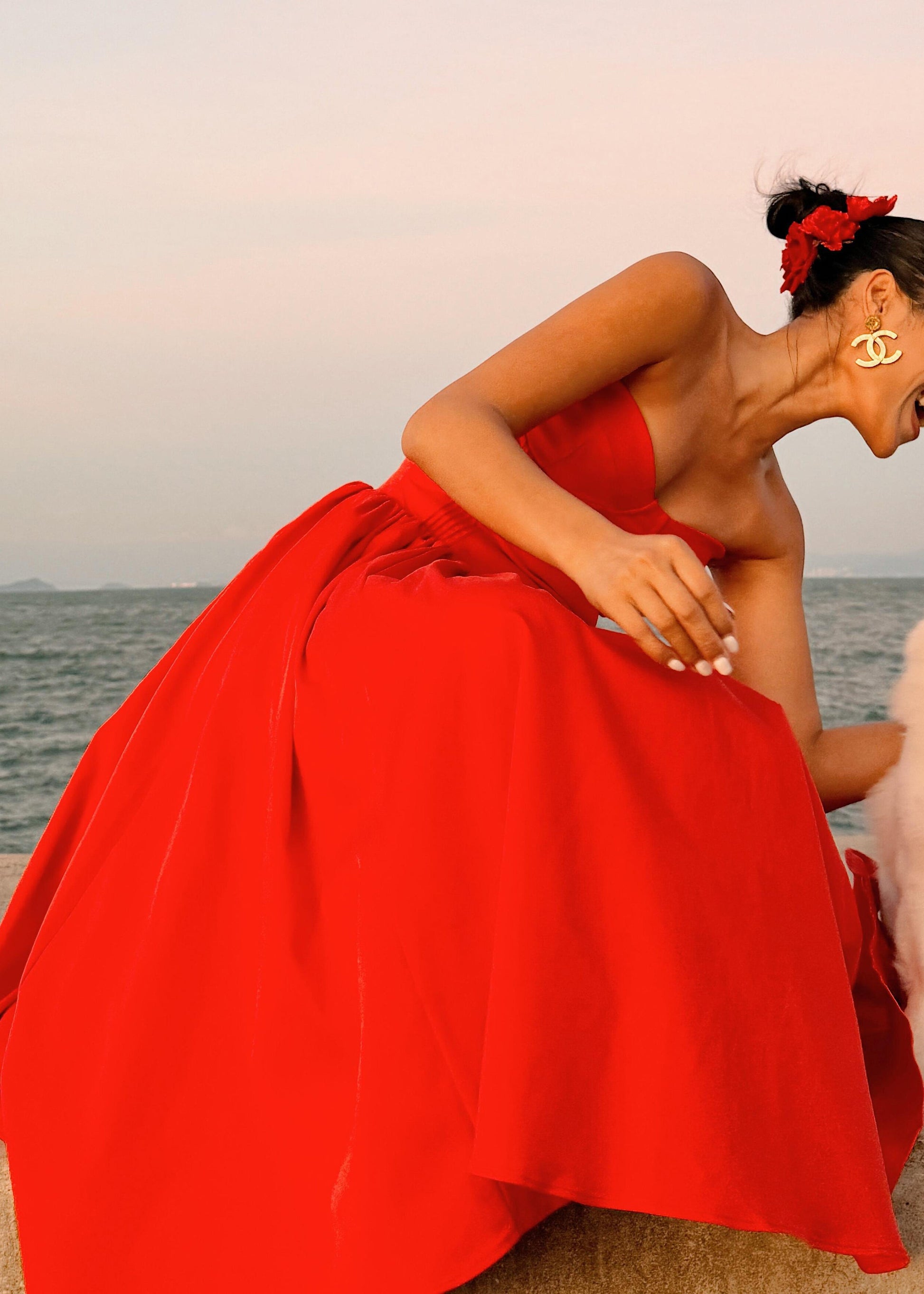 Italian Red Wrinkled Patchwork Cotton Strapless Dress Summer