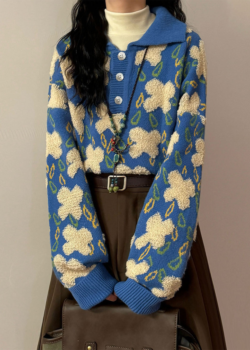 Jacquard Black Peter Pan Collar Button Cozy Knit Sweater Spring