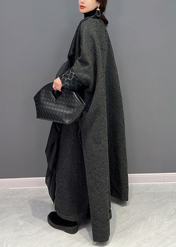 Lose Schwarz V-ausschnitt Asymmetrische Patchwork Krawatte Taille Langen Mantel