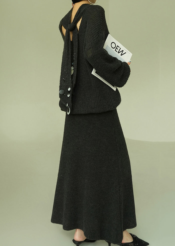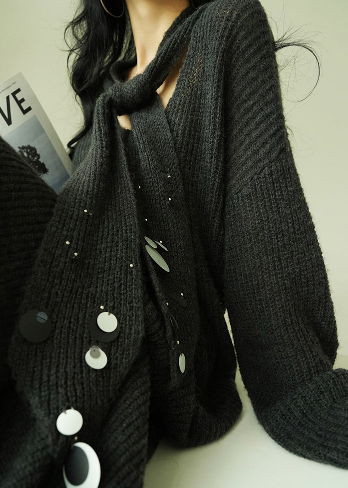 Loose Grey V Neck Sequins Knit Two Pieces Set Spring