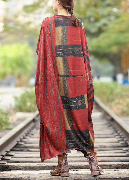 Lose rote V-Ausschnitt Patchwork Leinen Seide lange Kleider Frühling