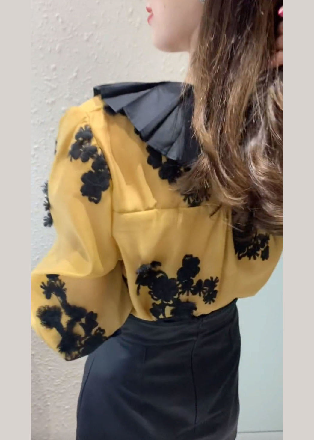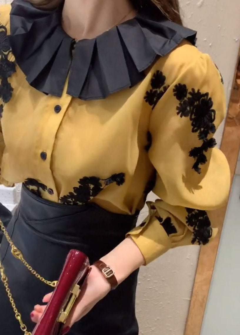 Lose gelbe Knopfspitze Patchwork Chiffon Shirts Laterne Ärmel