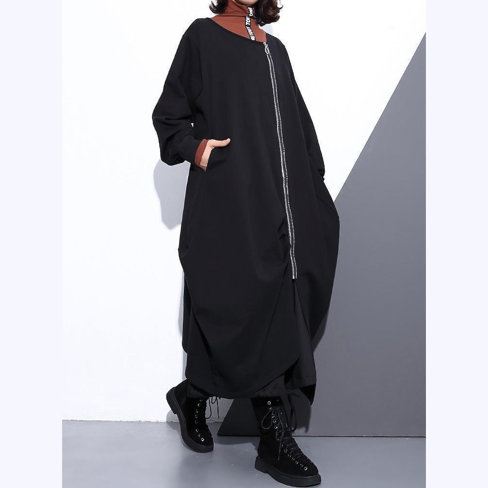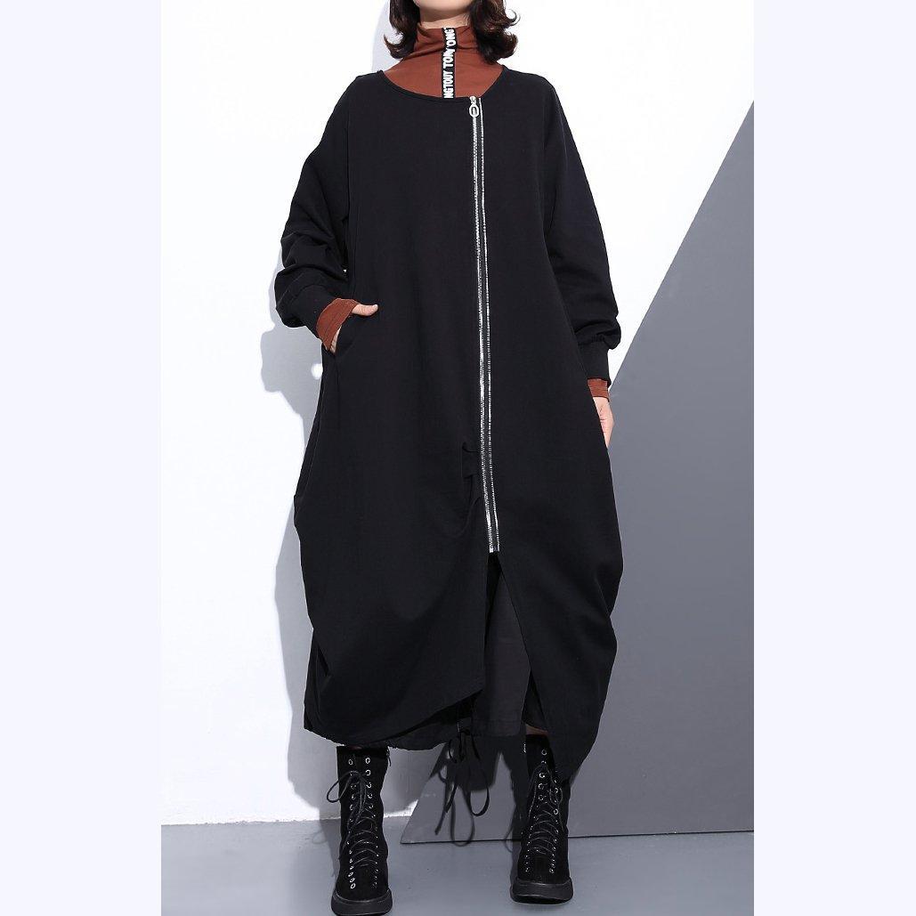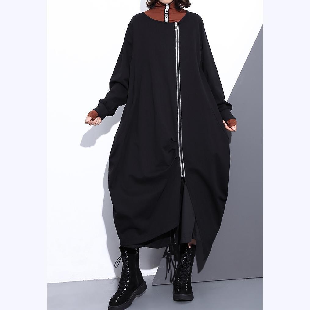 Luxuriöser schwarzer Mantel in Übergröße mit O-Ausschnitt und asymmetrischem Design, feine lange Mäntel mit Reißverschluss