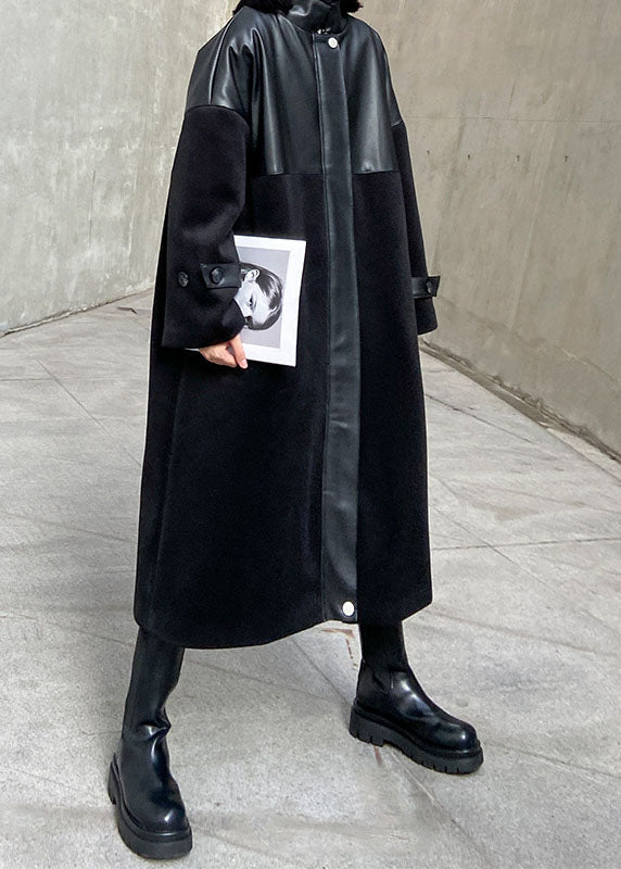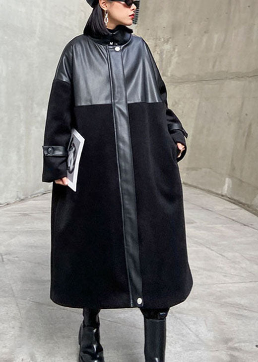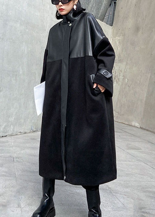 Luxus Schwarz Woolen Patchwork PU reißverschluss Winter Baumwolle Frauen Mäntel