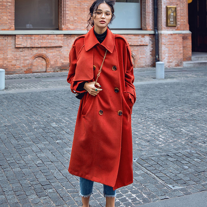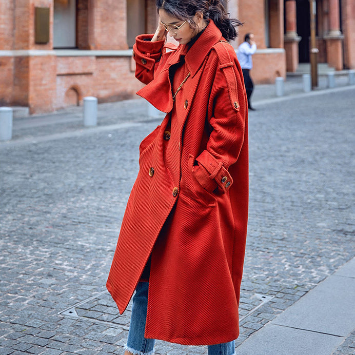 Luxuriöser roter Wintermantel in Übergröße, gekerbte Tunika, Mantel in Top-Qualität mit Taschen und Bindegürtel