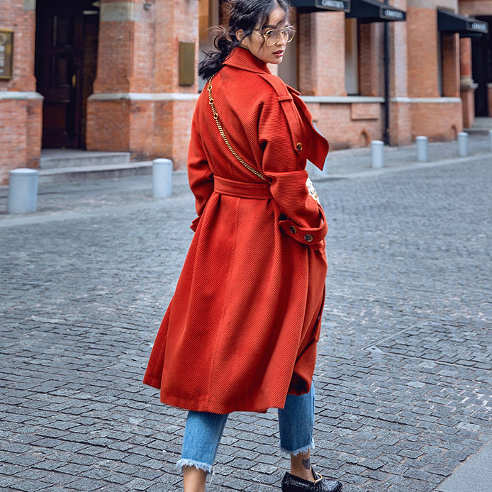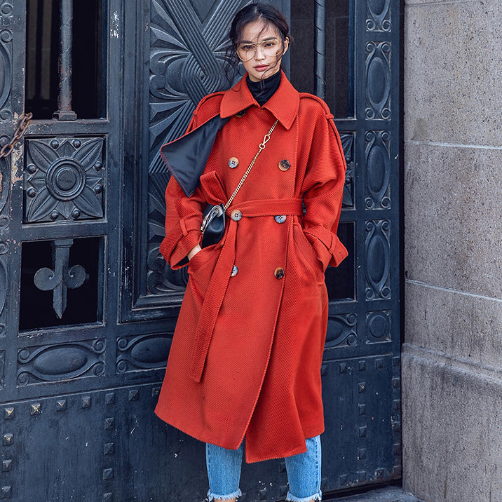 Luxuriöser roter Wintermantel in Übergröße, gekerbte Tunika, Mantel mit feinen Taschen und Taillengürtel