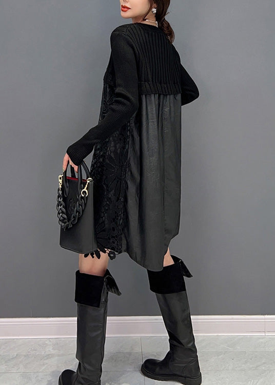 Modernes schwarzes O-Ausschnitt besticktes Strick-Patchwork-Kunstleder-Mittelkleid für den Winter