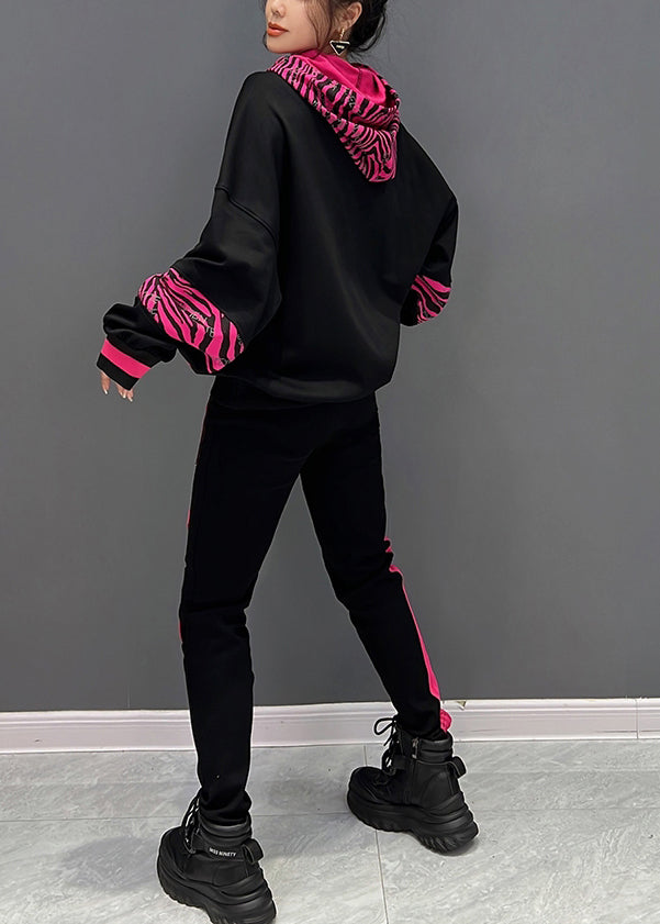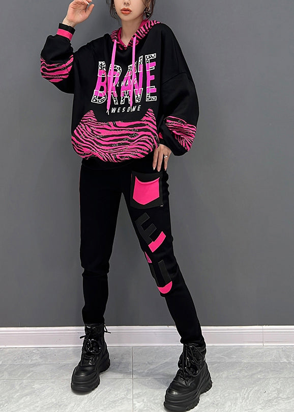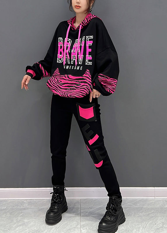 Moderner schwarzer Print Kapuzenpullover und Hose Zweiteiler Set Herbst