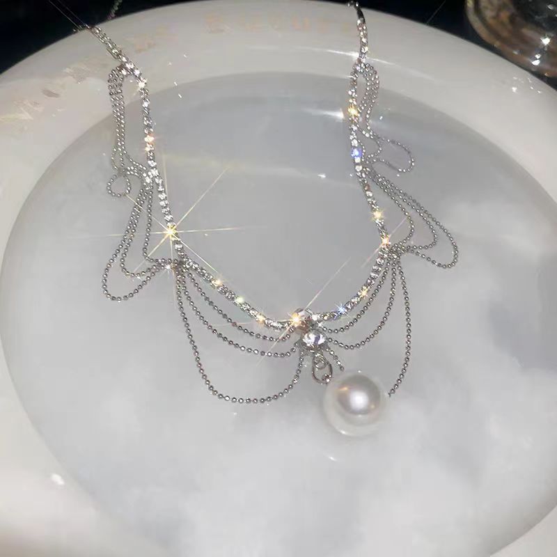 Modern Gold Copper Pearl Zircon Draping Pendant Necklace