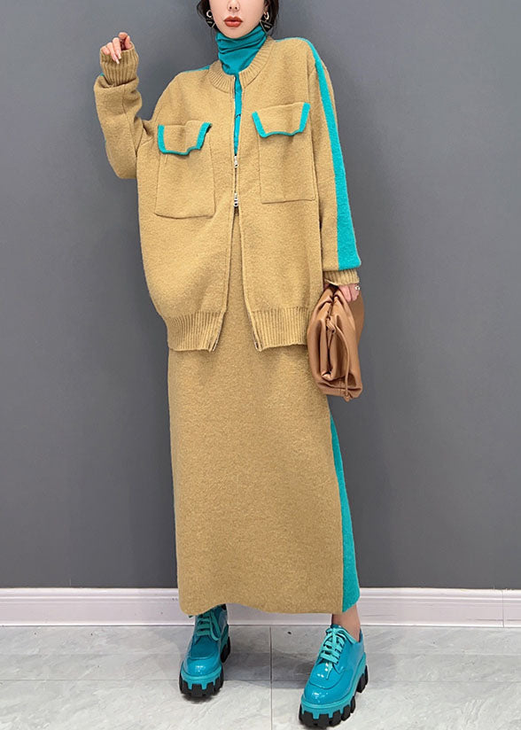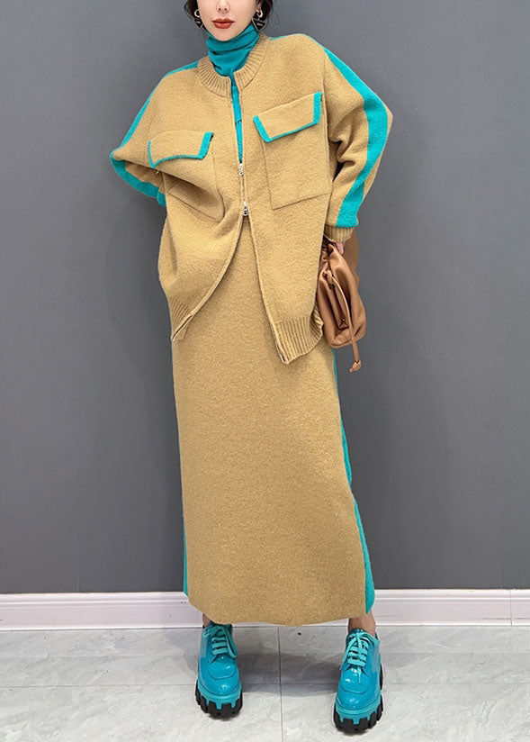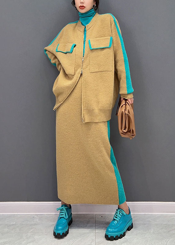 Moderne Gelb Reißverschluss Patchwork Dicken Strick Cardigan Und Rock Zwei Stücke Set Winter
