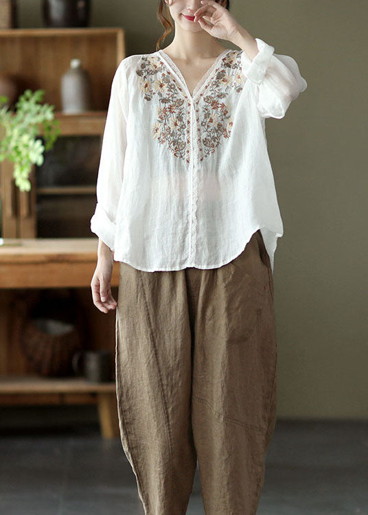 Naturweißes Leinenhemd mit V-Ausschnitt und langen Ärmeln