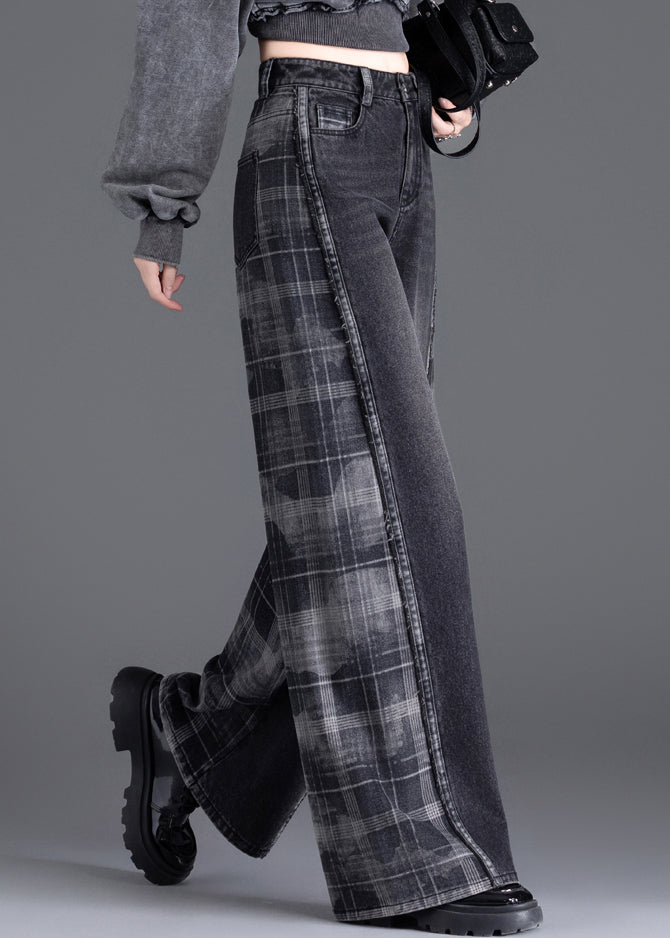 New Black Pockets Plaid Patchwork Warm Fleece Denim Pants Winter