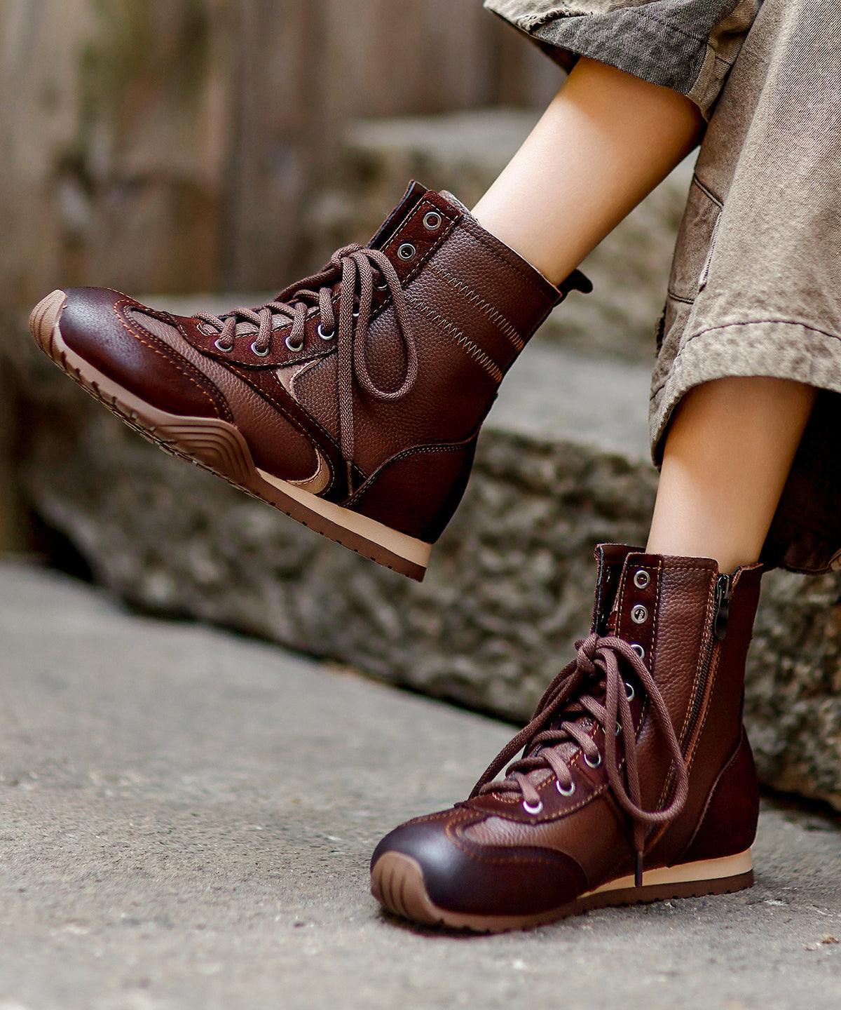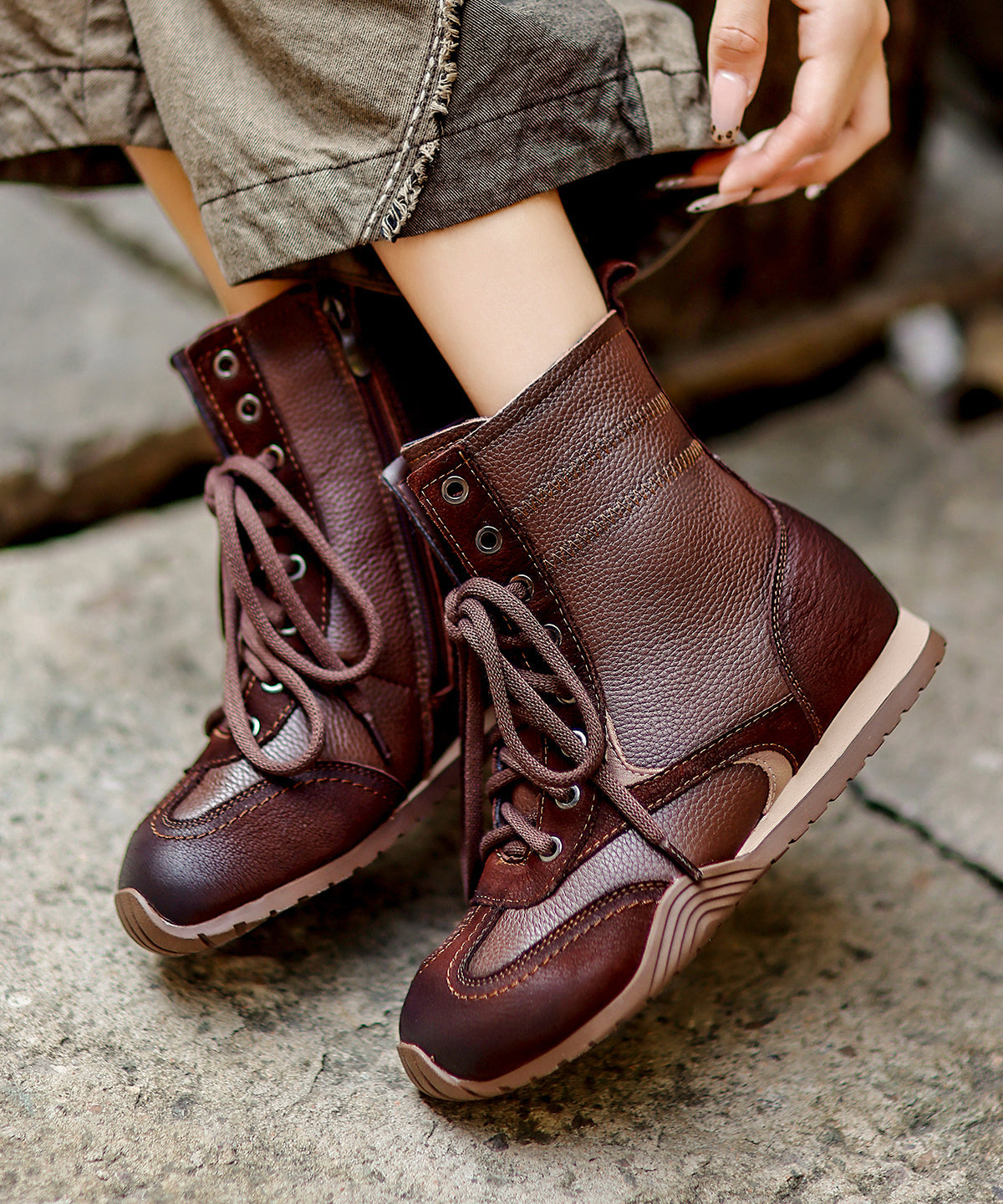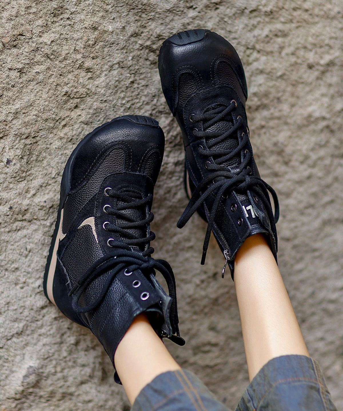 New Lace Up Splicing Boots Black Cowhide Leather Fuzzy Wool Lined
