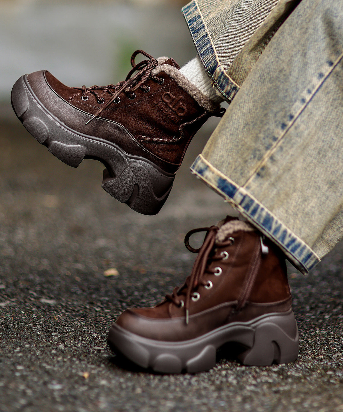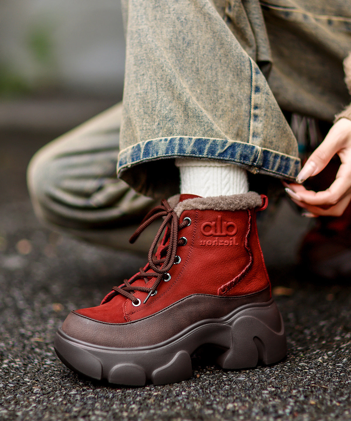 New Lace Up Splicing Platform Boots Red Cowhide Leather Fuzzy Wool Lined