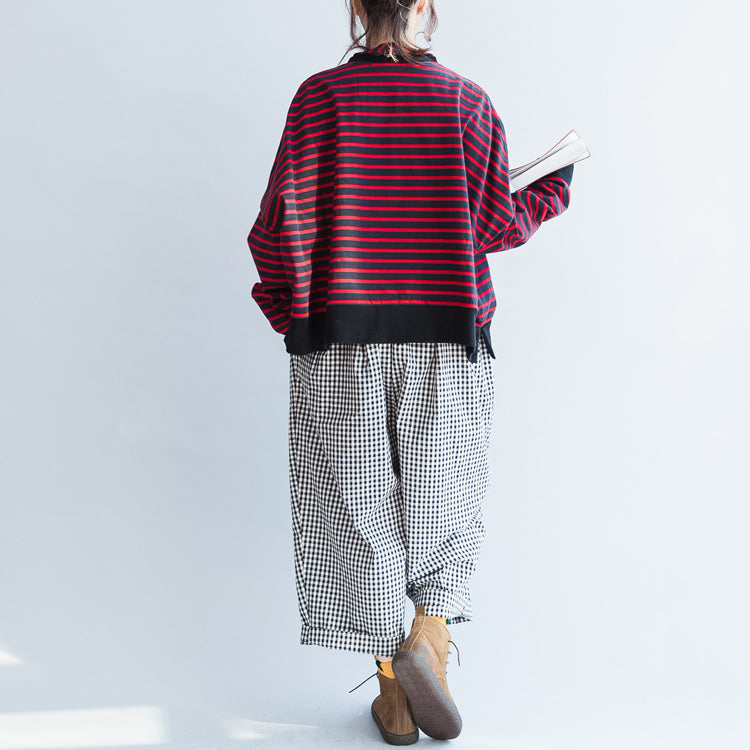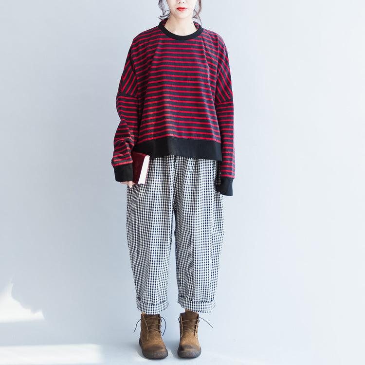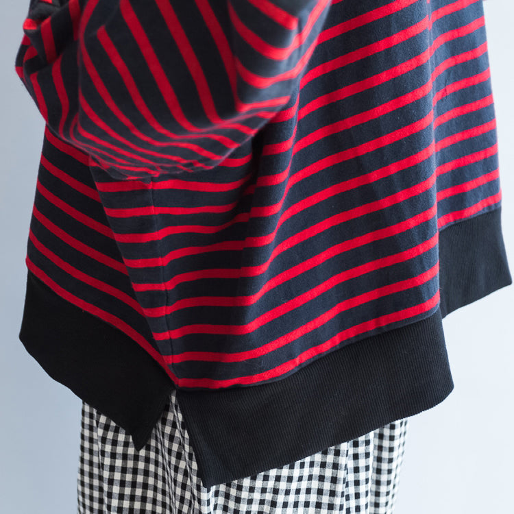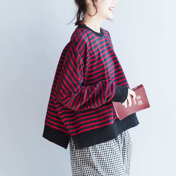 neues rot-schwarz gestreiftes Baumwoll-T-Shirt mit übergroßen Fledermausärmeln und seitlich geöffnetem Pullover