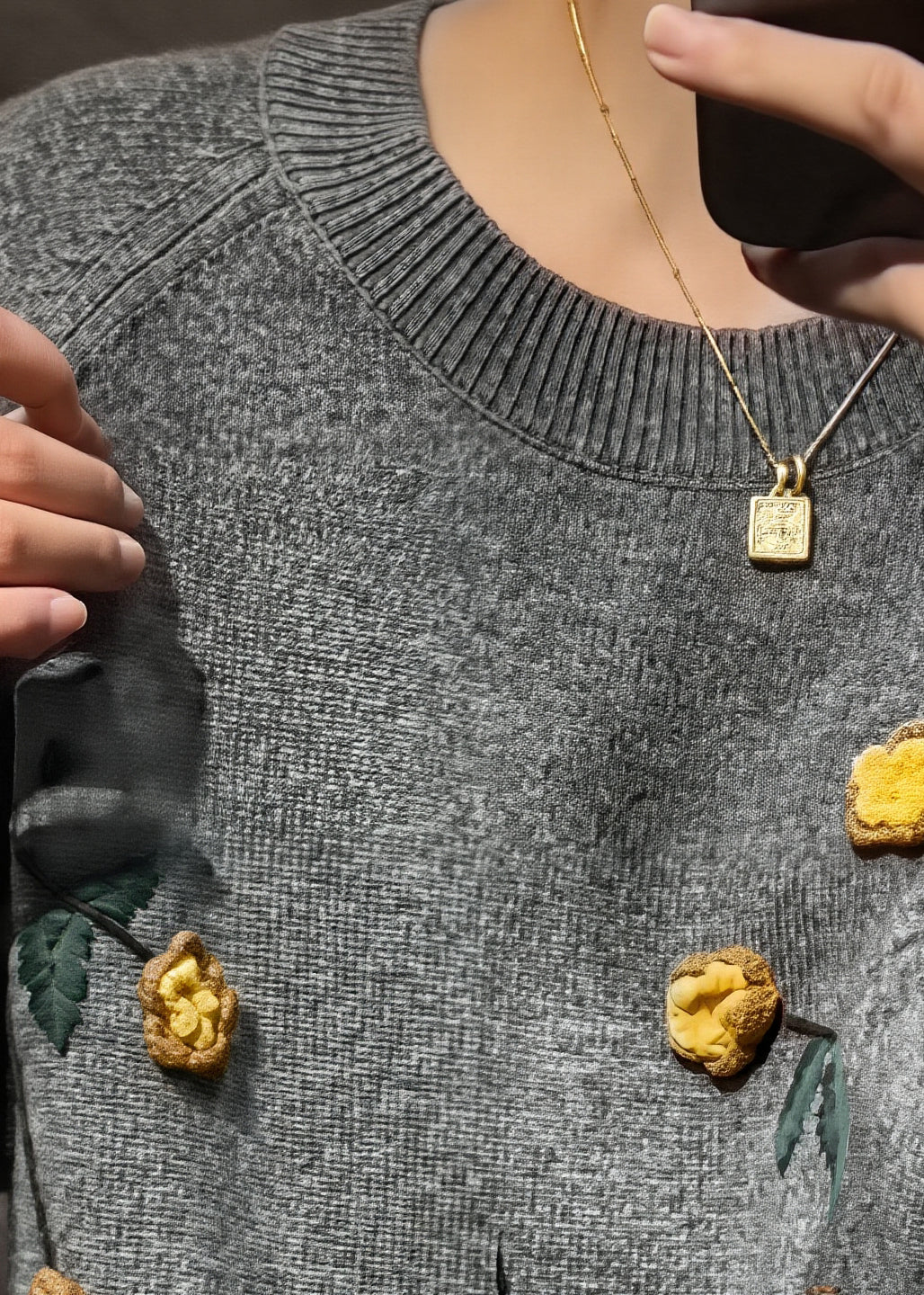 Novelty Grey O-Neck FloralCozy Cotton Knit Sweaters Spring