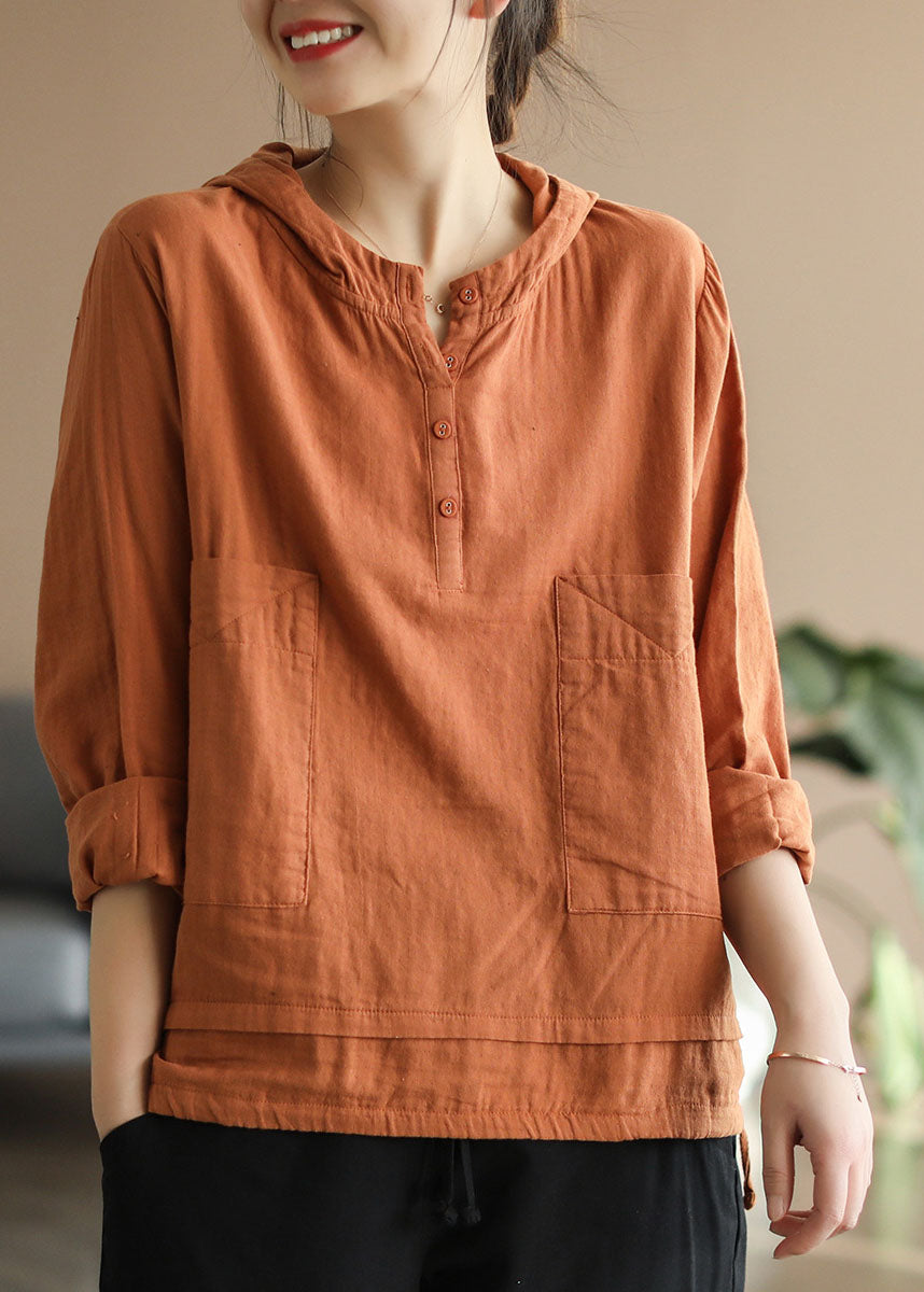 Orange Baumwollhemden Top Kordelzug Kapuze Langarm