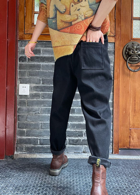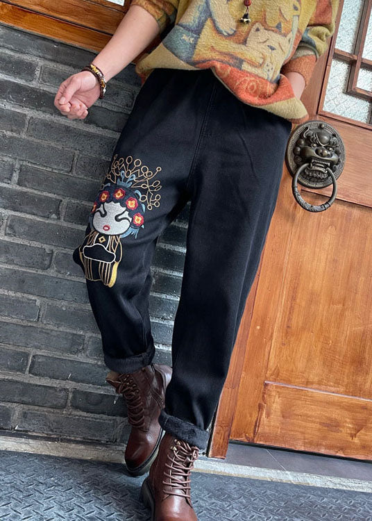 Bio-schwarze bestickte dicke Jeanshose Winter