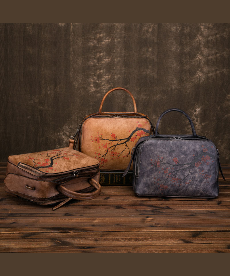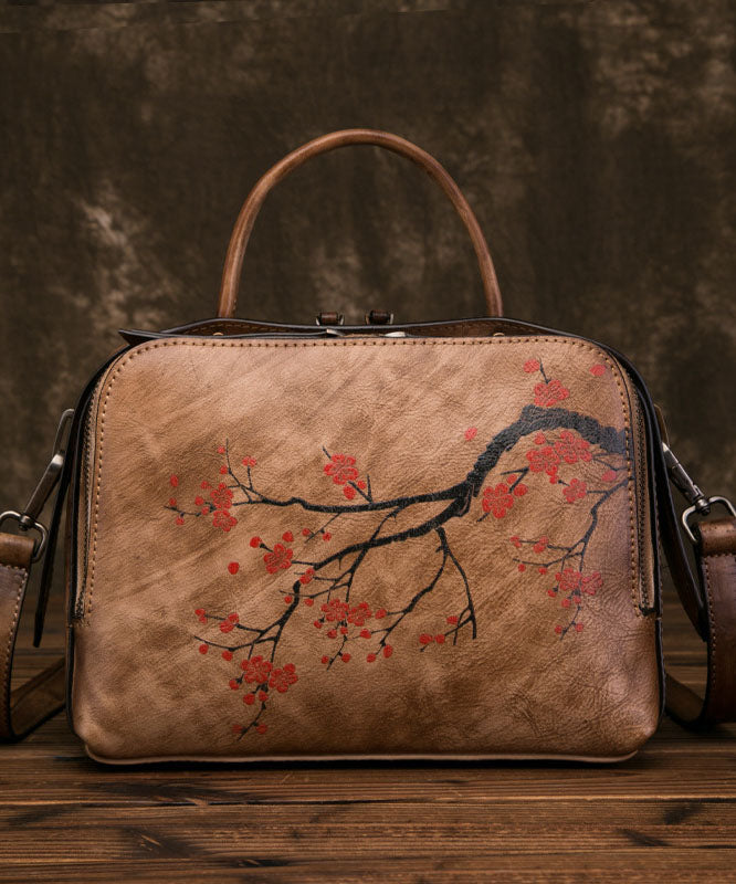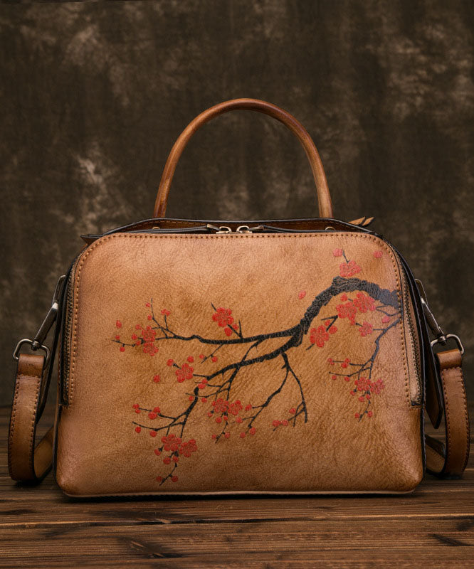 Umhängetasche aus organischem Kalbsleder in Gelbbraun mit Blumenmuster