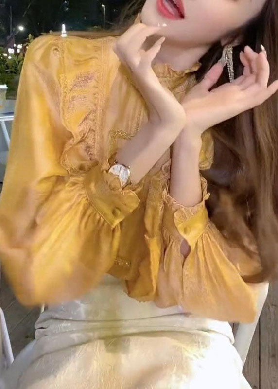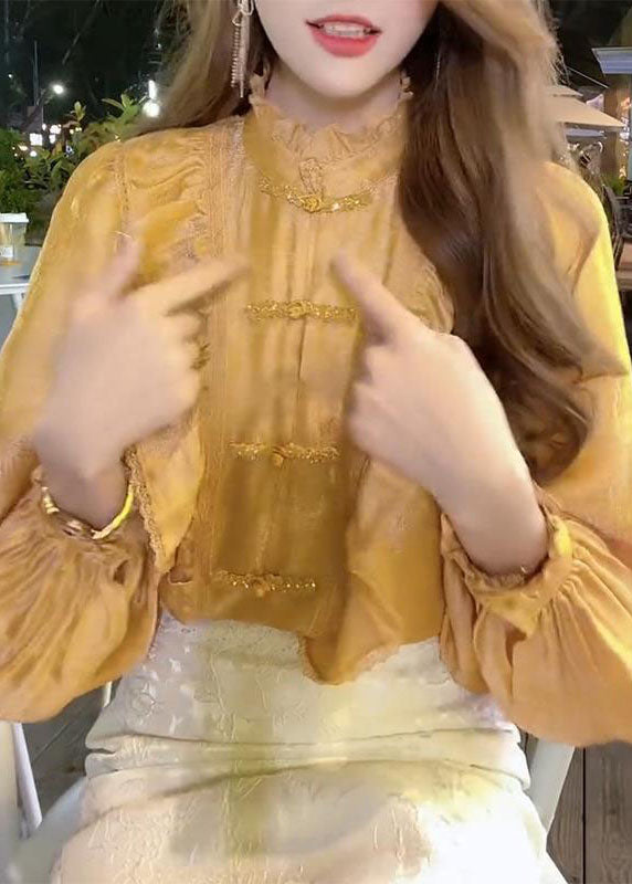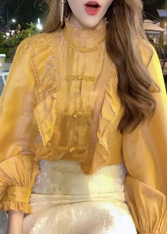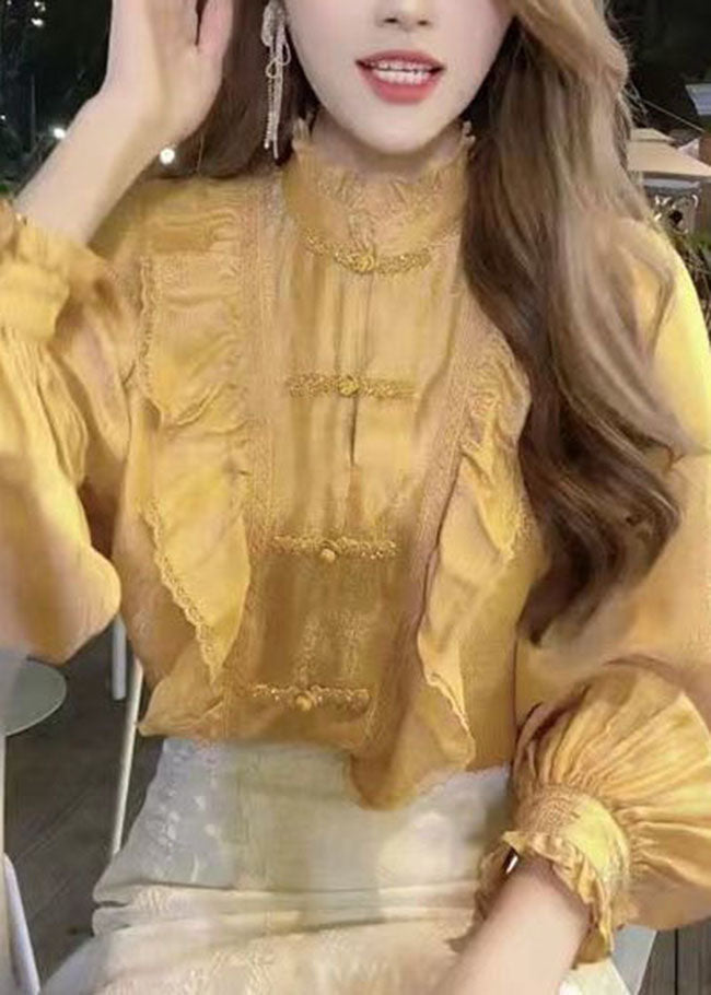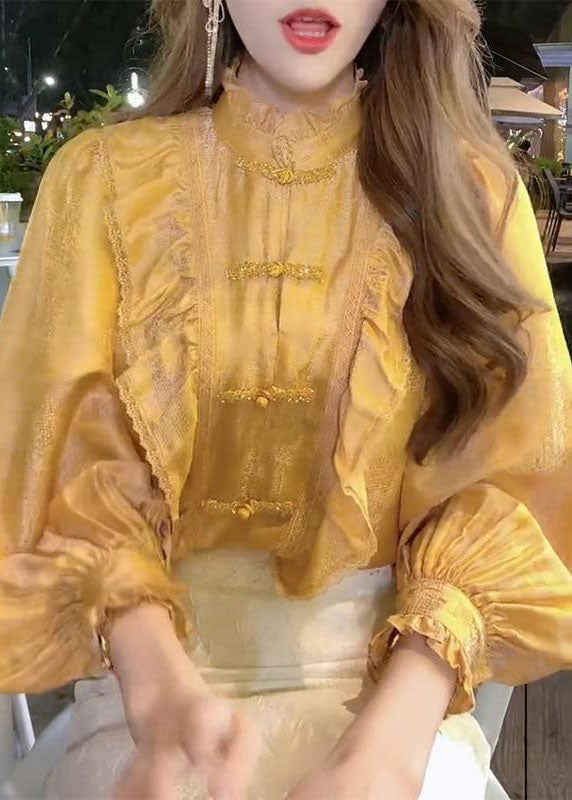 Bio-Gelb Stehkragen Knopf Rüschen Tops Laterne Ärmel