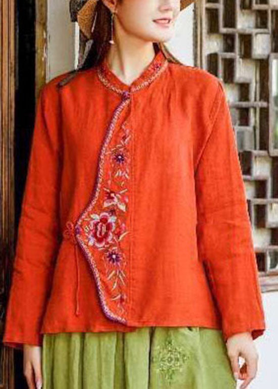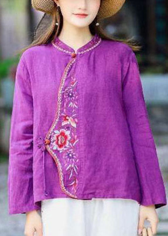 Orientalisch Blau O-Ausschnitt Krawatte Taille bestickte Leinen Tops Frühling