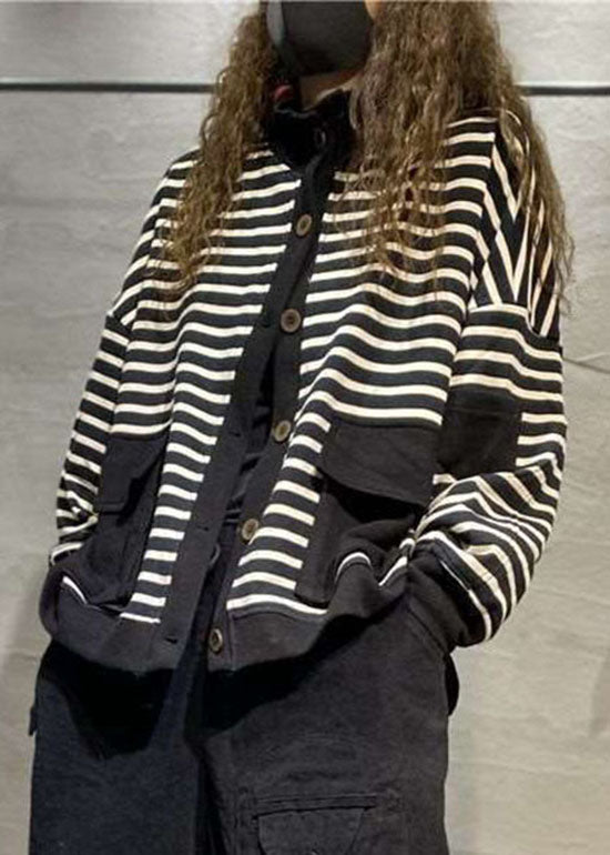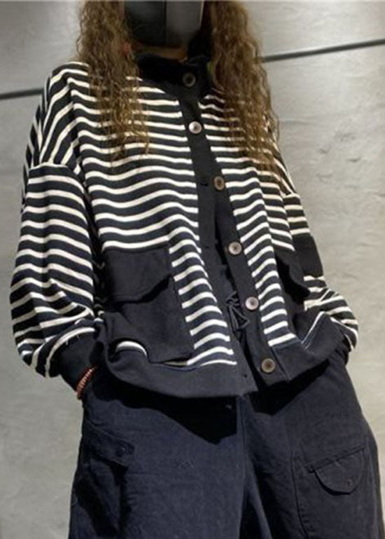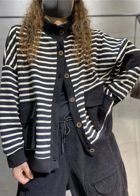 Plus Size Schwarzer Knopf Stehkragen Taschen Mäntel Langarm