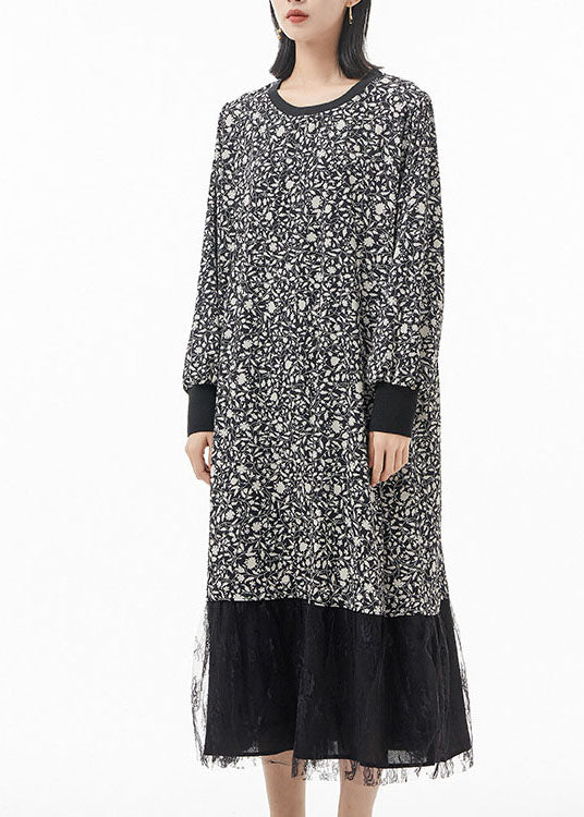 Plus Size Schwarz O-Ausschnitt Print Tüll Patchwork Seide Partykleid Frühling