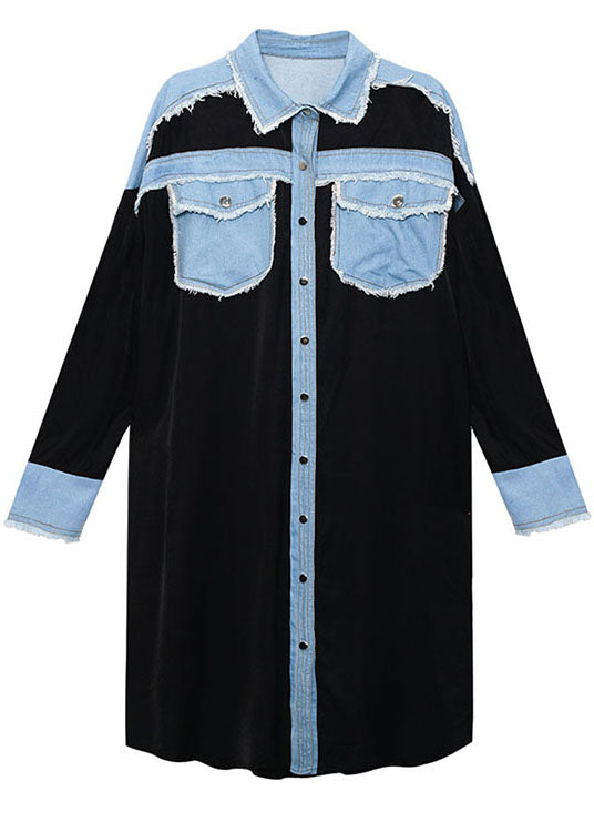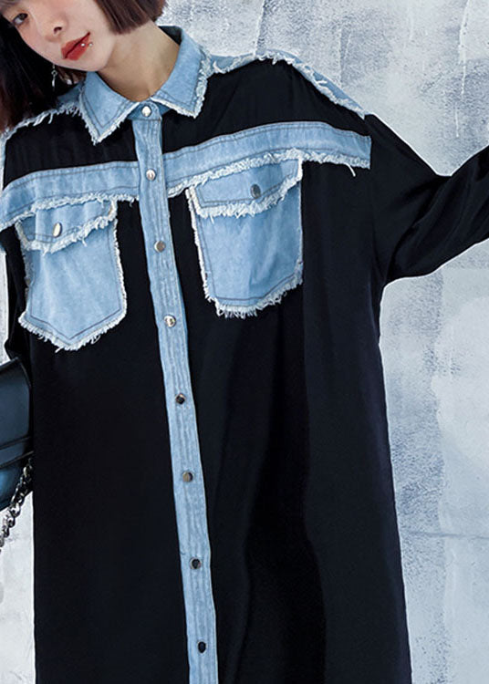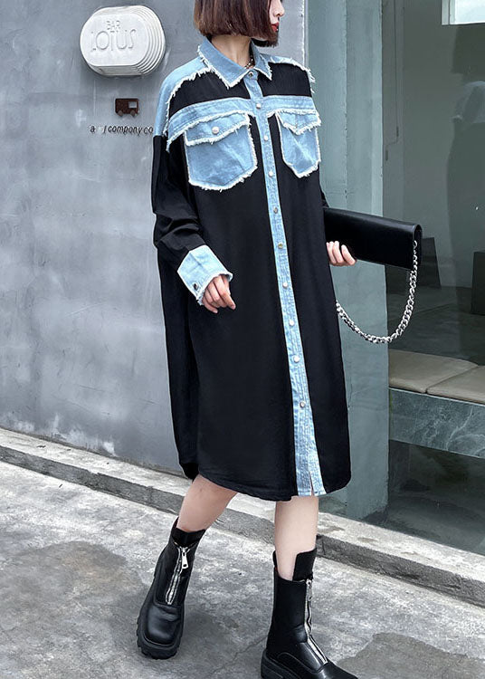 Plus Size Schwarze Taschen Patchwork Knopf Herbstkleider Langarm