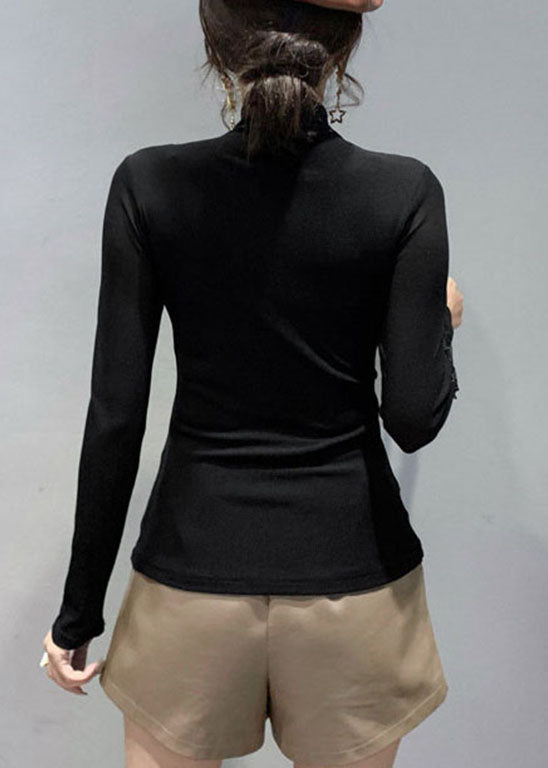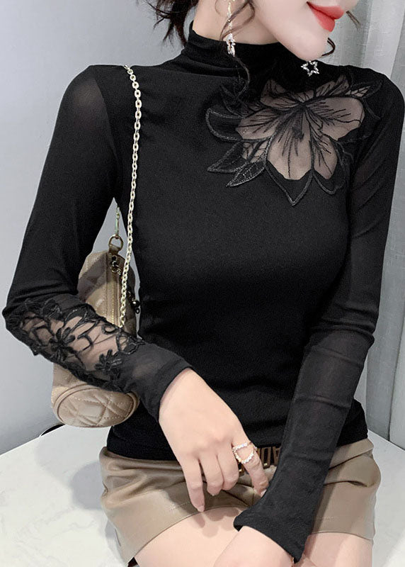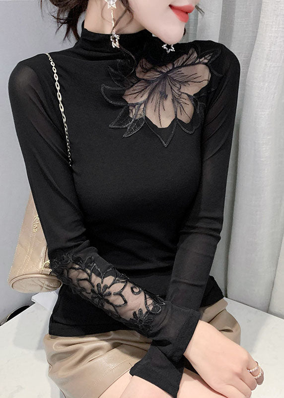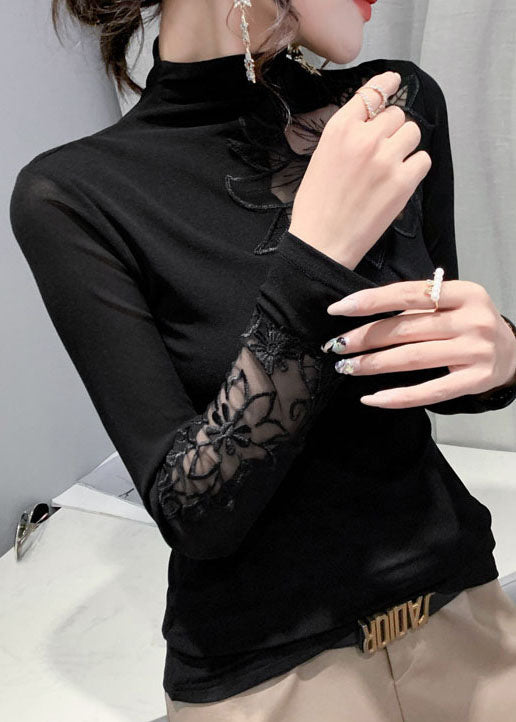 Plus Size Schwarze Stehkragen Tüll Patchwork Tops Frühling