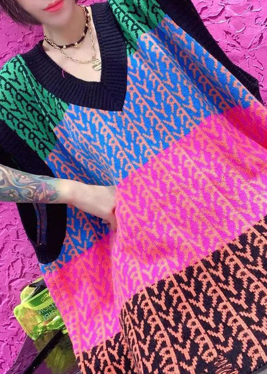 Plus Size Schwarze V-Ausschnitt Lose Patchwork Herbst Bluse Tops Strickweste