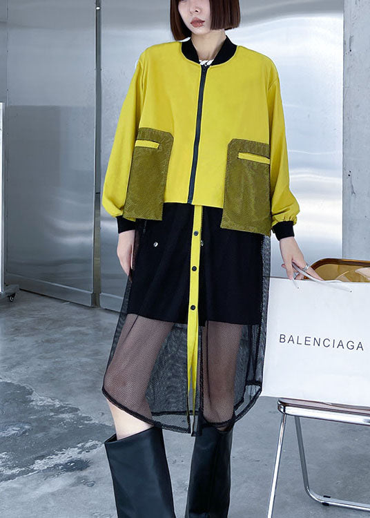 Plus Size Schwarzer Trenchcoat mit Reißverschlusstaschen aus Tüll-Patchwork