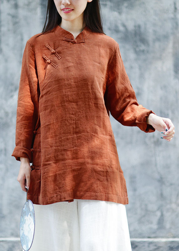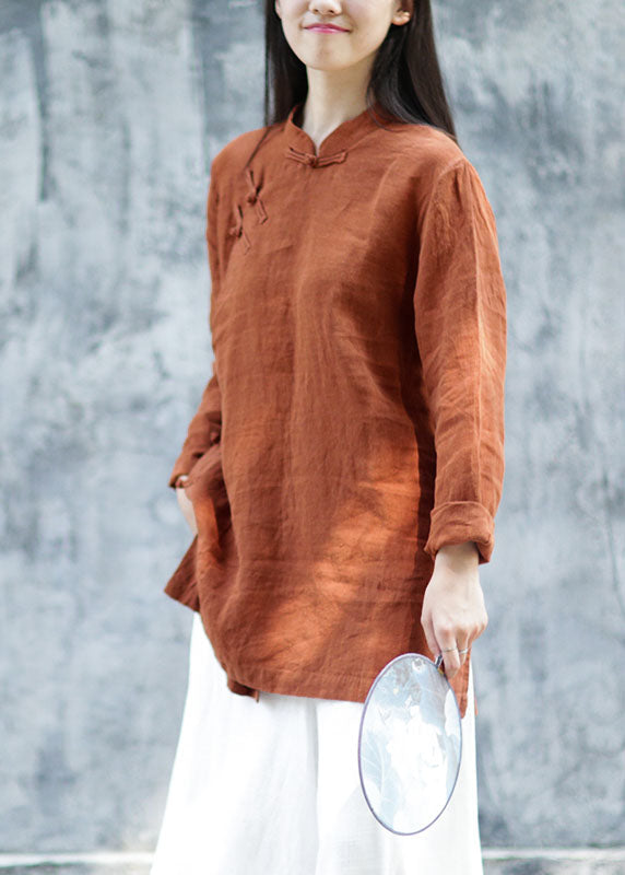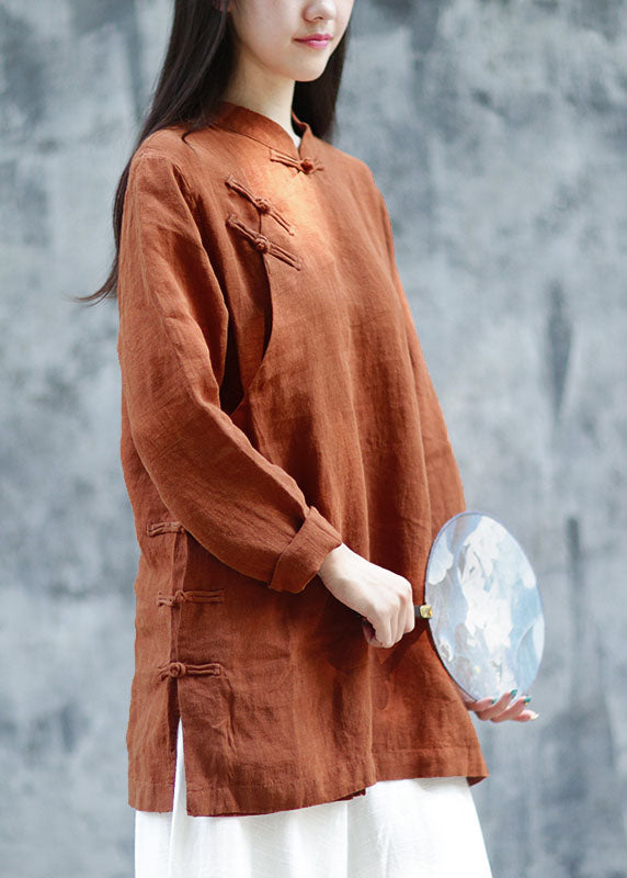 Plus Size Braune Leinenblusen mit Knöpfen Frühling