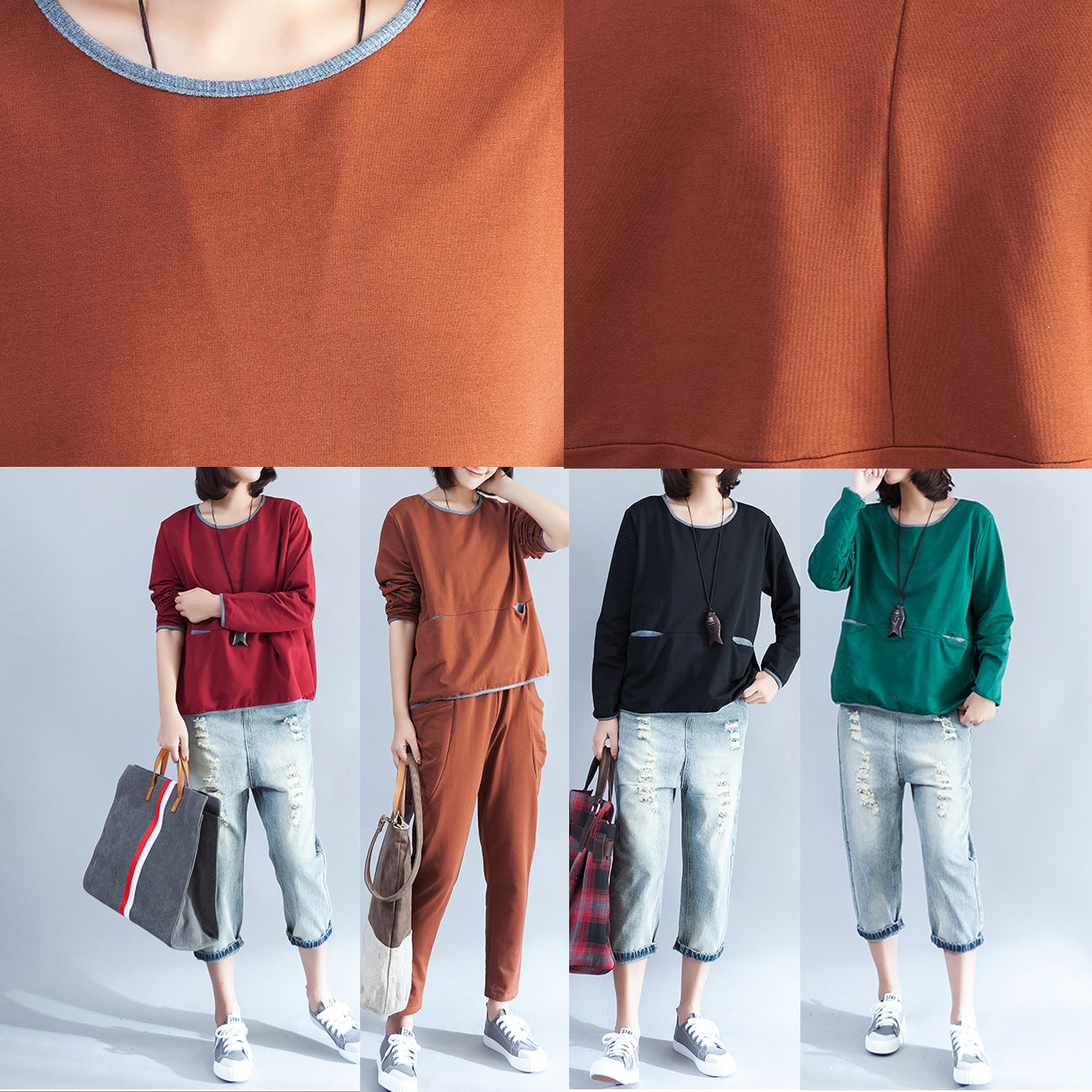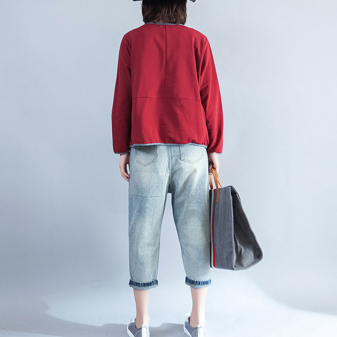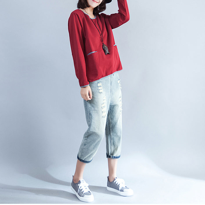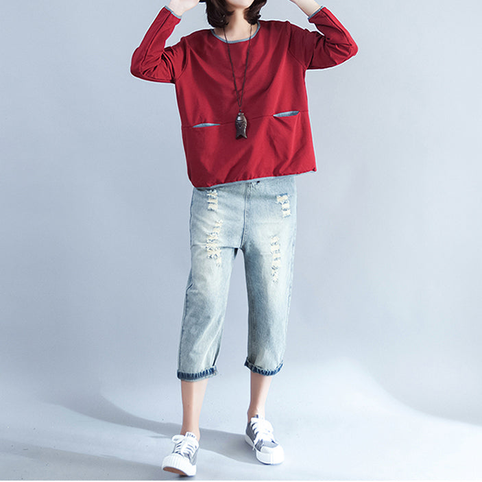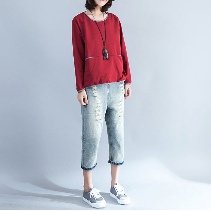 Lässiges Baumwoll-T-Shirt in Übergröße, burgunderfarben, klobige Langarmoberteile