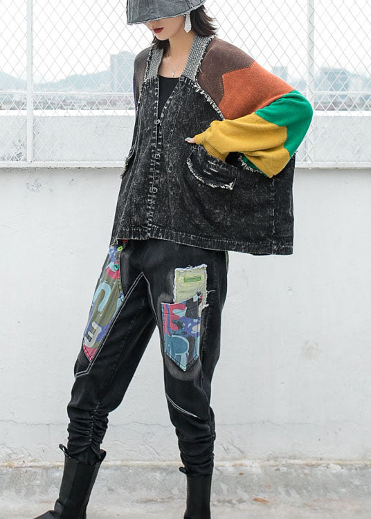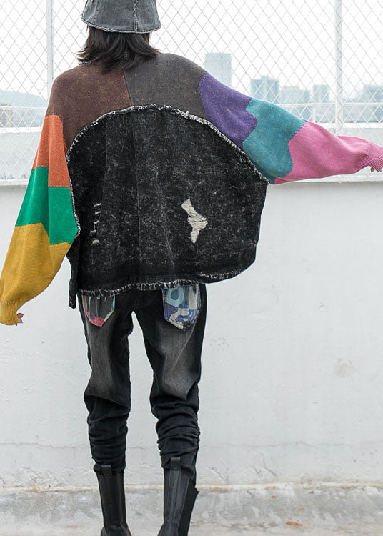 Plus Size Denim V-Ausschnitt Strick Patchwork Asymmetrisches Design Herbst Langarmmantel