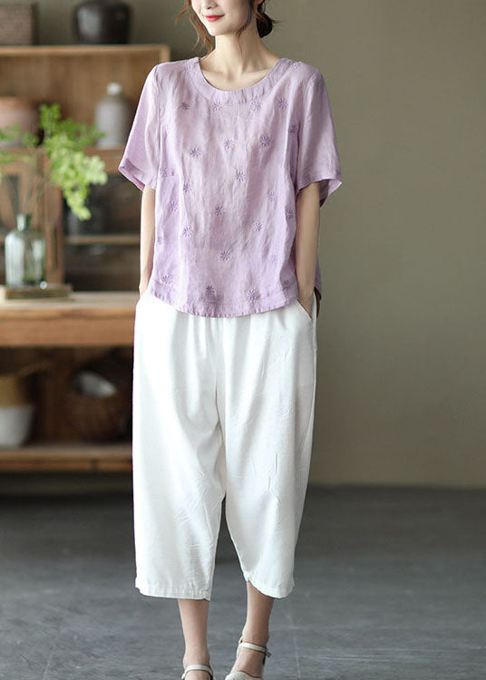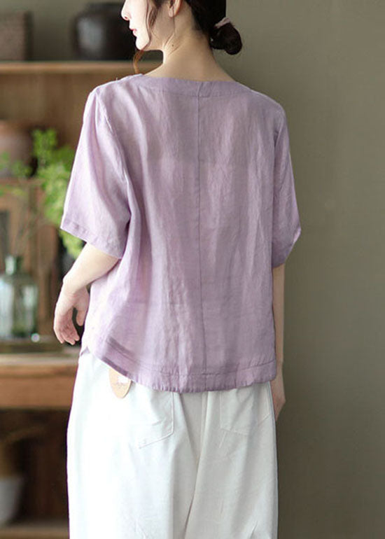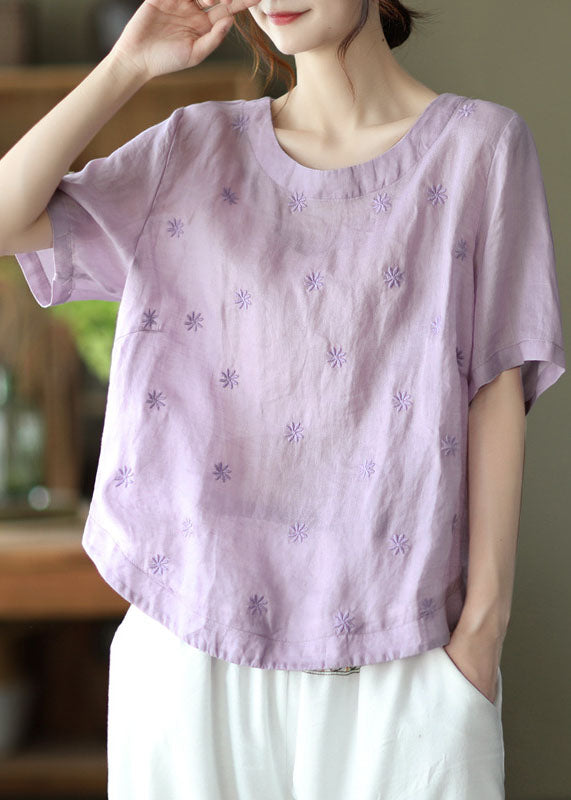 Plus Size Hellviolette bestickte Leinenhemden mit kurzen Ärmeln