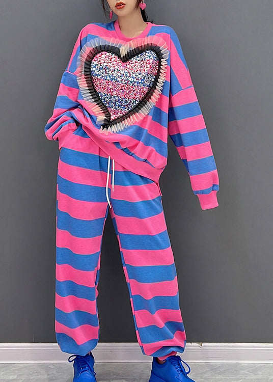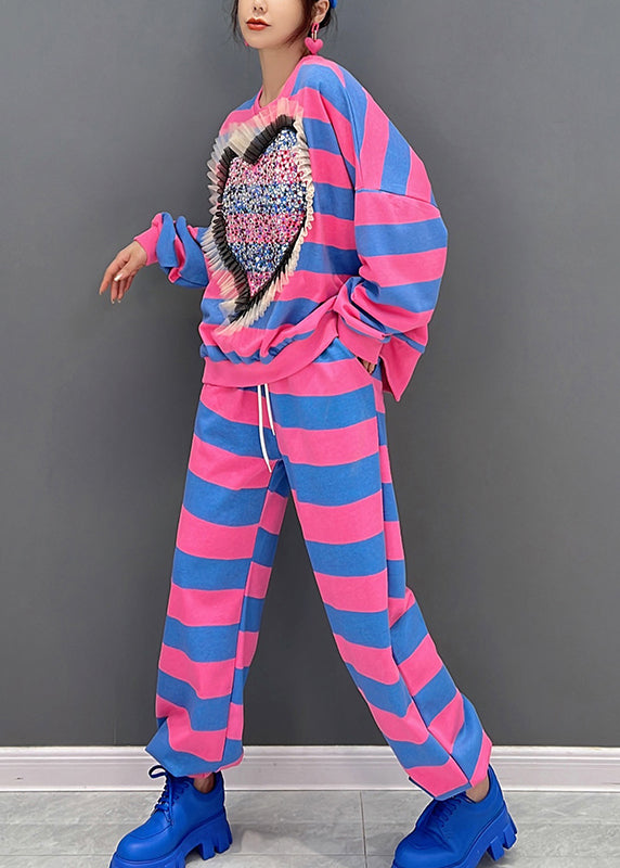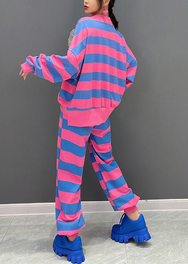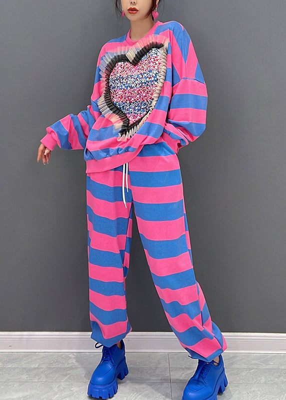 Rot Blau Gestreiften O-Ausschnitt Helle Diamant Top Und Hose Zwei Stücke Set Herbst